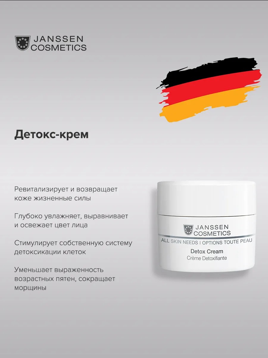Skin Detox Cream - An innovative 24-hour detox cream for reliable protection from oxidative stress and premature aging. It has a light texture and a delicate scent. Thanks to avocado peptides and active ingredients that stimulate the natural cellular detoxification process, it revitalizes and restores vitality to the skin, deeply moisturizes, evens out and refreshes the complexion after just one use. With regular use, it reduces the appearance of age spots and wrinkles. Improves the condition of skin with age-related changes, hyperpigmentation, post-acne, and rosacea - skin looks younger and healthier. Especially recommended after illness. Ingredients: Avocado peptides: convert cellular metabolic products into energy; promote the breakdown of cellular toxins and the transformation of such substances to synthesize new proteins beneficial for the skin. Yeast extract with alpha-glucan polysaccharide: reduces lipofuscin accumulation, thus reducing the appearance of age spots; enhances skin's light reflectivity, making it look smooth, fresh, and radiant. Vitamin E: prevents premature skin aging. Vitamin C: easily penetrates the skin and binds free radicals. Hyaluronic acid: provides extreme hydration, has powerful water-retaining properties. Real Japanese silk: has a structure similar to skin; is quickly absorbed, protects the skin from dehydration, gives it elasticity and softness. Saccharide isomerate: firmly binds to skin keratin and provides optimal hydration. ISIS: improves lipid adhesion in the stratum corneum and reduces transepidermal water loss. Directions: Apply Skin Detox Cream to cleansed face and décolleté morning and/or evening.