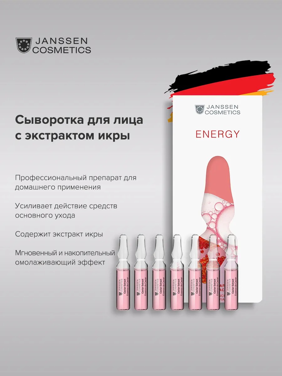 Caviar Extract - Обновленная, молодая кожа, наполненная новой энергией – эффект применения anti-age концентрата с настоящим «королевским» ингредиентом. Экстракт икры и экстракт морского планктона возрождают уставшую, тусклую кожу, потерявшую упругость и лоск. Подаренные глубинами океана компоненты в комбинации с гиалуроновой кислотой насыщают кожу необходимыми питательными веществами – аминокислотами, витаминами и влагой, повышают ее упругость и разглаживают морщины, возвращают свежесть и сияние. Текстура на водной основе, насыщенного розового цвета. Аромат роскошный. Преимущества: профессиональный препарат для домашнего; применения; результат дома – как после салонных процедур; усиливает действие средств основного ухода; содержит экстракт икры – роскошный ингредиент с уникальными anti-age свойствами и бустер увлажнения, мгновенно восстанавливающий гидробаланс кожи; мгновенный и накопительный омолаживающий эффект – увлажненная, мягкая, шелковистая кожа, заметный лифтинг и упругость; максимальная концентрация природных ингредиентов; биодоступная форма компонентов – глубокое проникновение и накопление в коже; возможная альтернатива инъекциям без ограничений и дискомфорта; стеклянная ампула – современный «медицинский» формат, минимум консервантов; точная монодоза, сохранность свойств и удобство применения; унисекс продукт, для любого типа кожи. Применение: оберните кончик ампулы бумажной салфеткой и отломите резким движением. Вылейте содержимое на ладонь и распределите по коже, дайте впитаться. Затем нанесите Caviar Creаm или крем по типу кожи. Только для наружного применения. Наносите на чистую кожу утром и вечером. Janssen Cosmetics - немецкий бренд профессиональной косметики мирового уровня. Мы являемся официальными эксклюзивными представителями бренда в России. Поставки идут напрямую из Германии, вся продукция оригинальная.
