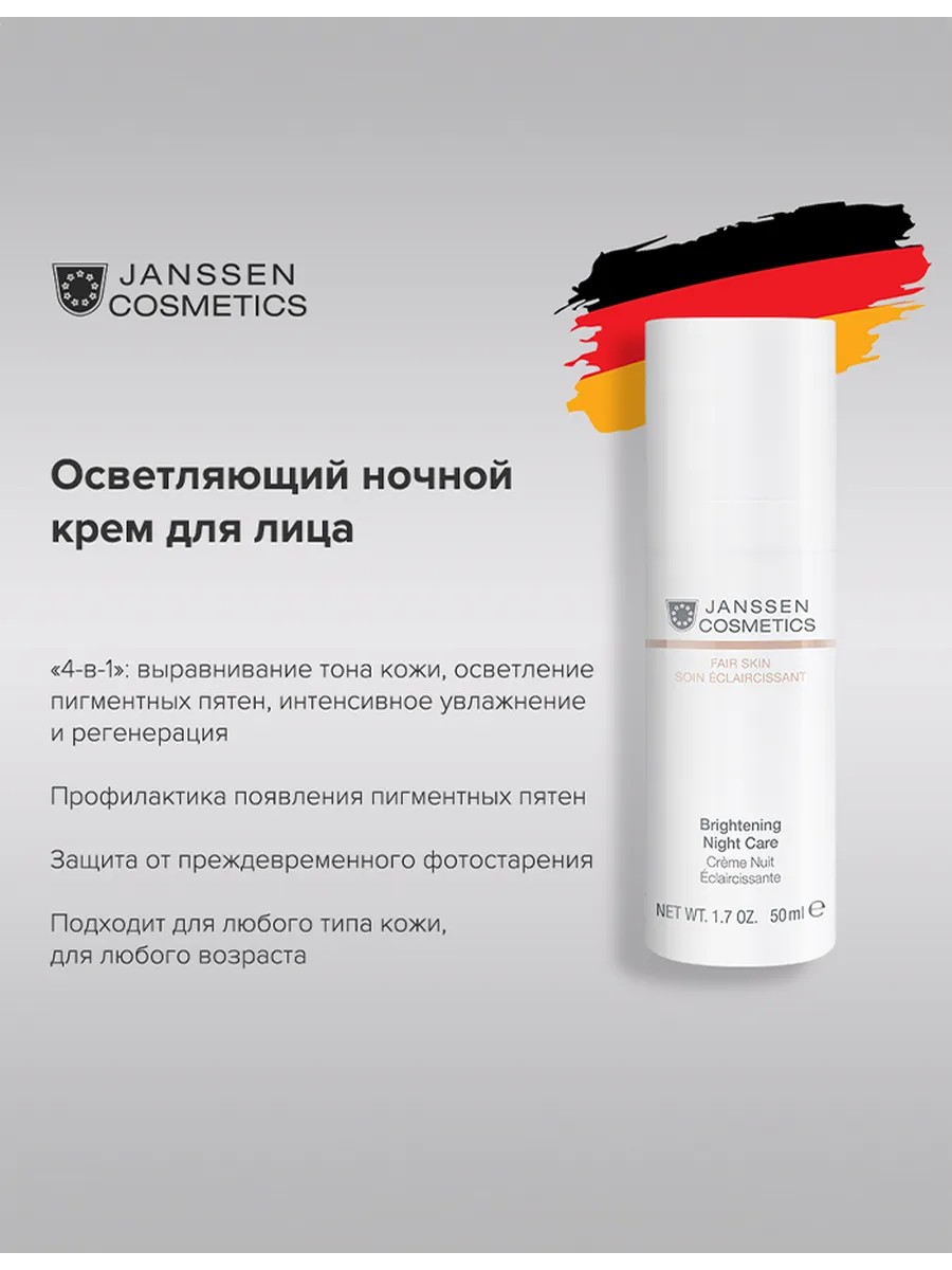 Result: With regular use (at least 8 weeks), the skin appears brighter, wrinkles are smoothed, and the skin looks radiant and youthful. Directions: Apply every evening to the face, neck, and décolleté with light massage movements, avoiding the eye area. Janssen Cosmetics is a German brand of world-class professional cosmetics. We are the official exclusive representatives of the brand in Russia. We ship directly from Germany, and all products are genuine.