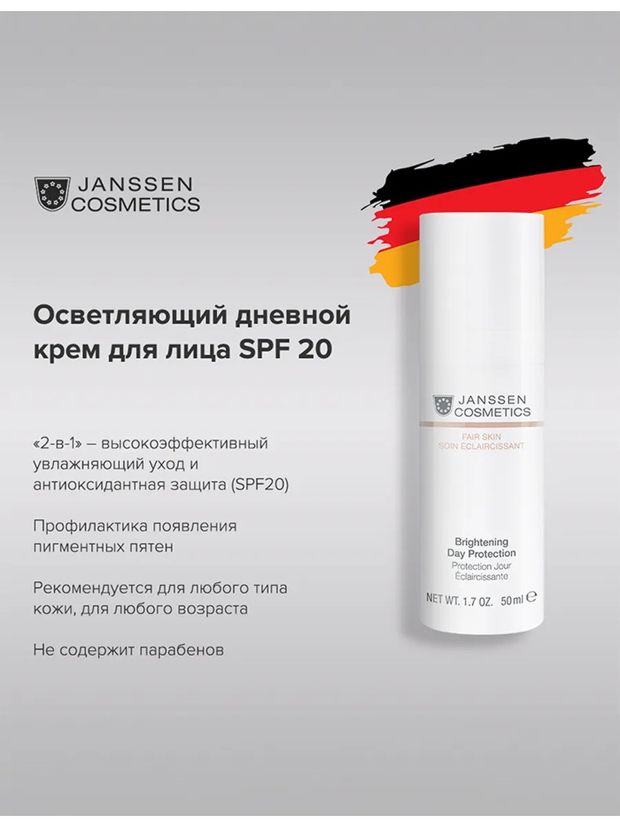 Осветляющий крем Brightening Day Protection с SPF 20 выравнивает тон и скрывает несовершенства кожи благодаря входящим в его состав сверхтонким белым пигментам. Высокоэффективный ингредиент гексилрезорцин оказывает на кожу осветляющее действие и при регулярном применении препятствует появлению нежелательной пигментации.Гексилрезорцин является мощным ингибитором тирозиназы, намного превосходящим по силе действия известный отбеливающий компонент гидрохинон в концентрации 4%, а также другие осветляющие ингредиенты – экстракт корня солодки, ниацинамид, различные формы витамина С и ретинола. В клинических испытаниях было доказано, что он способен заметно осветлять кожу за 8 недель. Кроме того, гексилрезорцин обладает антивозрастными свойствами и антиоксидантной активностью, препятствует процессам гликации, стимулирует синтез коллагена и эластина.Brightening Day Protection интенсивно увлажняет кожу и обеспечивает ей необходимый уход. Формула крема содержит сахар инвертный – идентичный коже углеводный комплекс, который насыщает и сохраняет влагу в коже в течение 72 часов. Светозащитные UVA/UVB-фильтры предотвращают индуцируемое солнечным излучением старение кожи и возникновение нежелательной пигментации.Результат: цвет лица выравнивается сразу же после нанесения продукта, кожа обретает сияние. При регулярном использовании (на протяжении не менее 8 недель) достигается визуальный осветляющий эффект.Применение: Наносите каждое утро на кожу лица, шеи и декольте легкими массажными движениями, избегая зоны вокруг глаз. Важно: Оконное стекло не защищает от УФ-излучения. Люди, рабочее место которых расположено рядом с окном и в течение дня освещается солнцем, могут заметить потемнение кожи (синтез меланина) несмотря на то, что не выходят из помещения. Janssen Cosmetics - немецкий бренд профессиональной косметики мирового уровня. Мы являемся официальными эксклюзивными представителями бренда в России. Поставки идут напрямую из Германии, вся продукция оригинальная.