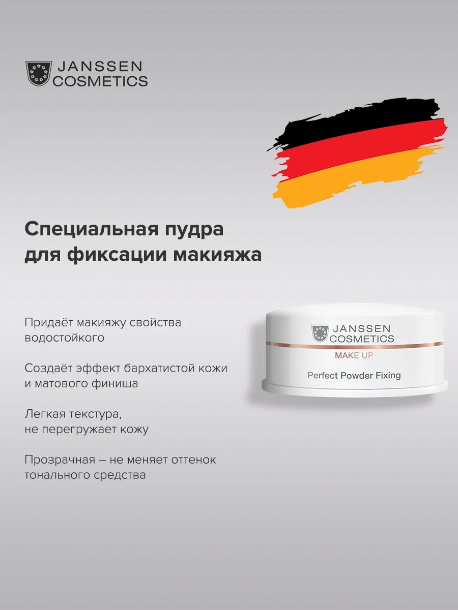 This special powder from the Janssen Cosmetics catalog is designed to set makeup. The loose Perfect Powder Fixing formula contains mineral and polymer components that fix makeup, control sebum production, mattify the skin, and maintain a velvety, fresh appearance throughout the day. It protects the complexion from excess moisture, preventing makeup from bleeding, creasing, and settling in pores and fine lines. This dermatologist-tested product doesn't cause unpleasant dryness, a mask-like sensation, or irritation, maintaining the natural softness and elasticity of skin tissues and helping cells retain moisture.