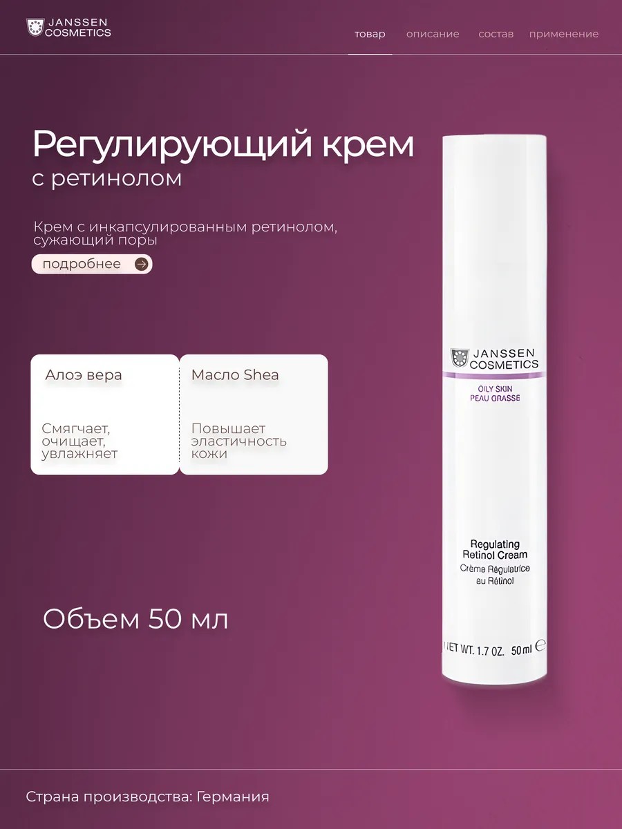 Regulating Retinol Cream от профессиональной косметики Janssen Cosmetics — это эффективное и безопасное решение, сочетающее в себе всё необходимое: омоложение, уход за воспалённой кожей, глубокое увлажнение и комфорт в использовании.