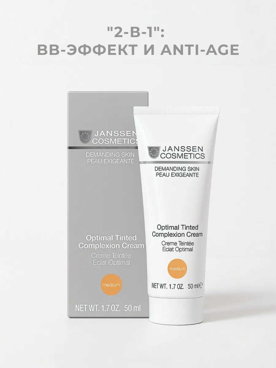 Optimal Tinted Complexion Cream Medium is an intelligent tinted cream for all-day skin care: it moisturizes, softens, and provides antioxidant protection. It reduces the appearance of wrinkles caused by dryness. The delicate texture is easy to apply and distribute, giving the skin a beautiful, lightly tanned shade and a healthy glow. Absolute comfort – you don’t feel it on your skin, making it a great alternative to decorative foundation. Benefits: 3-in-1 cream: anti-aging care, SPF protection, and tinting effect. The best alternative to BB cream, a must-have in your makeup bag. Perfect skin tone without makeup. Suitable for all skin types and ages. A favorite cream among teenagers. All-season use. Can be used as a makeup base instead of foundation. Economical consumption (1 pea). Hypoallergenic. Safety and effectiveness confirmed by the Dermatest GmbH Research Institute, Germany. Janssen Cosmetics is a German brand of world-class professional cosmetics. We are the official, exclusive representative of the brand in Russia. We source our products directly from Germany, and all products are genuine.