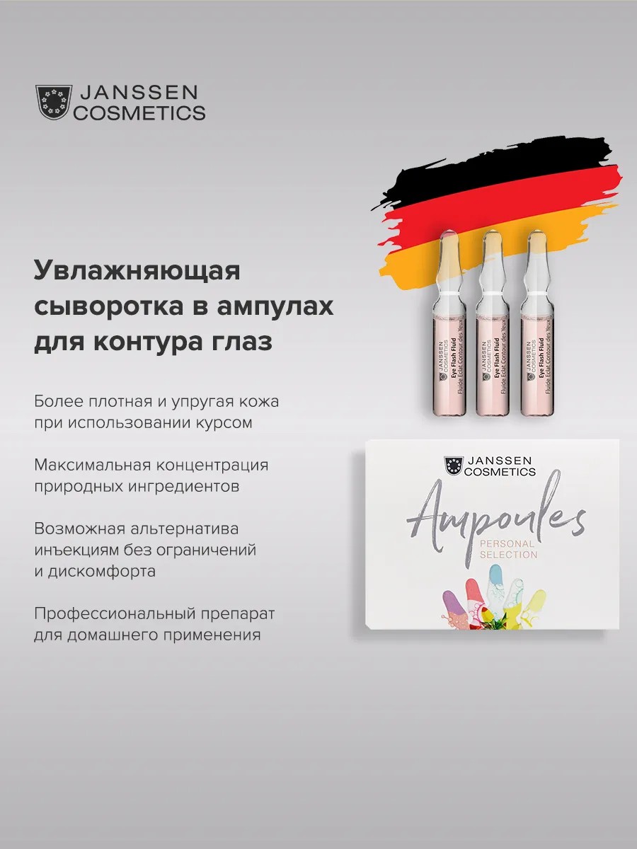 Eye Flash Fluid - Eye Flash Fluid с гиалуроновой кислотой и пептидным комплексом-продукт интенсивного ухода, разработанный специально для истощенной и чувствительной кожи вокруг глаз. Всего за несколько минут Eye Flash Fluid возвращает коже сияние и свежесть. Запускает процесс естественного восстановления истощенной кожи вокруг глаз. Преимущества: -Мгновенно и пролонгированно увлажняет.-Восстанавливает оптимальный гидробаланс кожи.-Разглаживает морщины.-Повышает упругость и эластичность кожи.-Обеспечивает выраженный лифтинг-эффект.- Активизирует синтез коллагена и гиалуроновой кислоты.-Запускает процесс естественного обновления кожи. Применение: наносите Eye Flash Fluid на чистую кожу вокруг глаз утром и/или вечером. Оберните головку ампулы бумажной салфеткой и отломите. Вылейте содержимое ампулы на ладонь, равномерно распределите по коже вокруг глаз легкими похлопывающими движениями. Только для наружного применения. Janssen Cosmetics - немецкий бренд профессиональной косметики мирового уровня. Мы являемся официальными эксклюзивными представителями бренда в России. Поставки идут напрямую из Германии, вся продукция оригинальная.