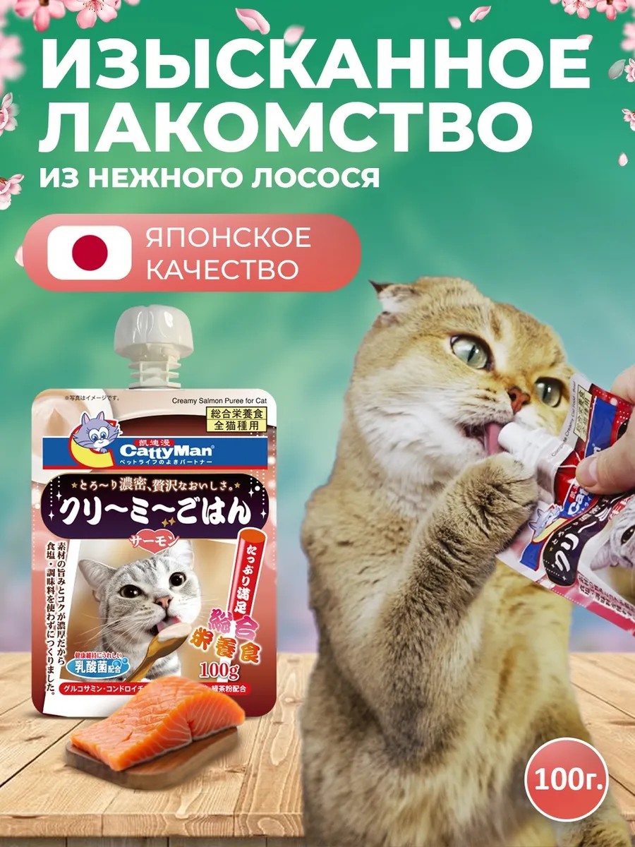 Japan Premium Pet wet food for cats over 2 months old is a complete wet food based on king salmon. 1 pack x 100g. This treat has a texture reminiscent of condensed milk. This natural wet food in a pouch is formulated with balanced nutrition in mind, using high-quality, safe, and carefully selected ingredients, and is enriched with vitamins and minerals. The puree-like texture of this treat is easy to consume and is an excellent supplement to the main food. For sterilized, non-productive cats. It promotes good digestion thanks to its nutrient content and low carbohydrate content. A balanced composition, natural ingredients, delicate flavor, and convenient packaging are the main features of our product. This food has a soft texture, an appetizing aroma, and a wonderful taste. Made using the latest Japanese technology and meets international quality standards. Even the pickiest kittens will appreciate the creamy texture. Contains no artificial colors, preservatives, or flavors. This formula helps improve gastrointestinal function and strengthen the immune system, restore strength to weakened cats during and after illness, regulate water balance during hot weather, and replenish moisture in cats who prefer dry food. Contains functional health supplements such as glucosamine, chondroitin, and taurine. Wet food isn't just food—it's a true delight for your pet! This wet food is a dish made with high-quality ingredients that will satisfy even the most discerning feline gourmets. Easy to consume, this pet product will become your four-legged friend's favorite treat. Only safe food additives are used in the diet. Keep out of reach of children. Refrigerate after opening.