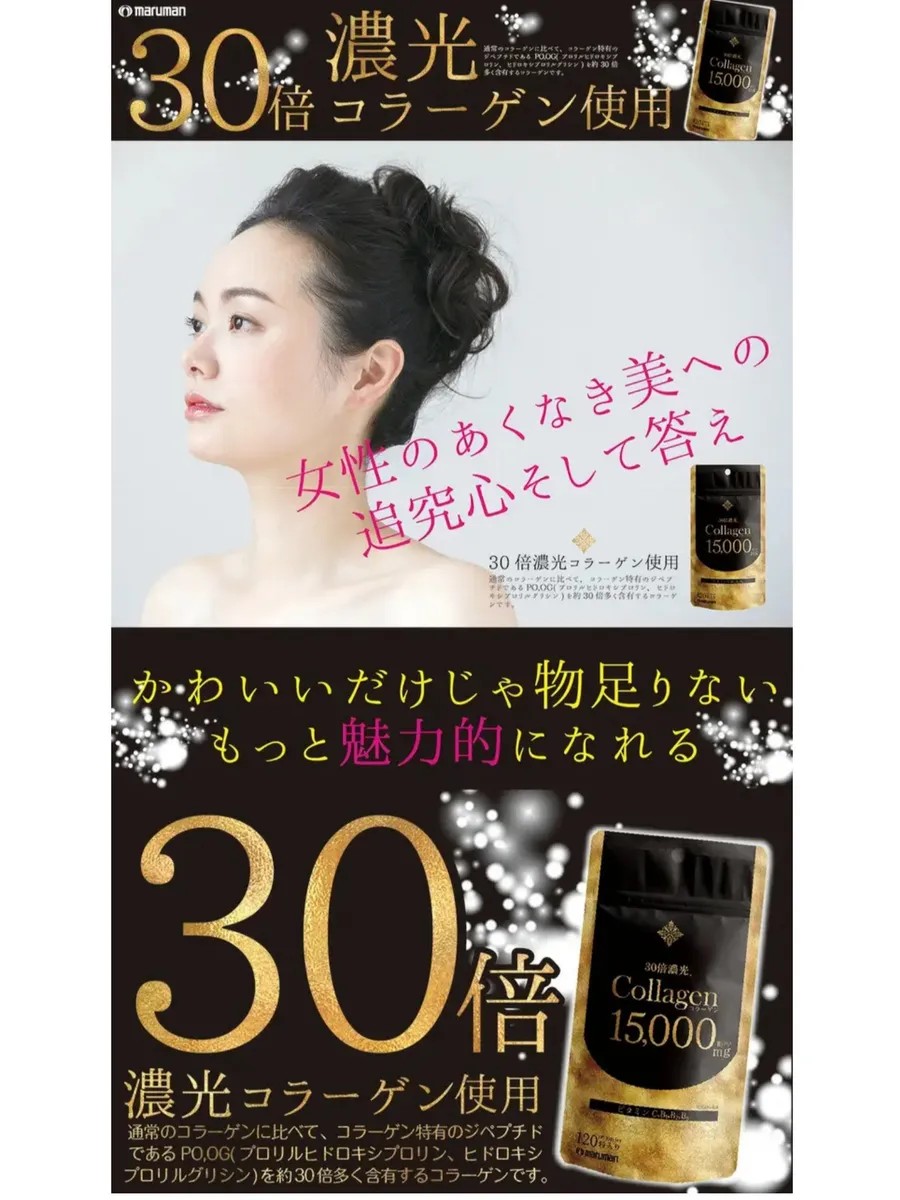 Коллаген в капсулах 15000, с витаминами С,В1, В2 и В6 В, 30 дней от MURUMAN. Основной компонент - модифицированный рыбный коллаген, который по сравнению с обычным содержит в 30 раз больше пептидов пролин-гидроксипролина и гидроксипролинглицина. В состав также входят повышающие эффективность употребления коллагена витамины С, В1, В2, и В6. Дневная доза (4 капсулы) содержит 500 мг пептидов рыбного коллагена, что ровняется 15,000 мг (15 г) обычного рыбного коллагена. Коллаген в капсулах для питания, увлажнения, оздоровления вашей кожи. Бад для костей Maruman это источник оздоровления, снятия боли и повышения подвижности. Дополнительно способствует укреплению и блеску волос, предотвращает ломкость ногтей.Коллаген содержащийся в баде для суставов Maruman имеет повышенное содержание морского коллагена - 15000 мг, он содержит в 30 раз больше пролилгидроксипролина и гидроксипролилглицина, чем многие другие коллагены. Он быстро расщепляется и всасывается в кишечнике. Витамин С синтезирует дополнительный коллаген в кожных тканях и выполняет роль антиоксиданта, препятствует пигментации, улучшает цвет лица, задерживает процессы старения кожи, суставов, хрящевой ткани, волос, ногтей, повышает подвижность и прочность суставов, глубоко увлажняет и повышает упругость и эластичность кожи, снижает пигментацию, разглаживает мимические морщины, устраняет угревые высыпания, шрамы, ожоги, растяжки, способствует росту и укреплению волос и ногтей, эффективен при дерматозах, псориазе, перхоти, борется с целлюлитом. Состав: морской (рыбный) коллаген, витамин С, витамин В1, витамин В2, витамин В6, кристаллическая целлюлоза, желатин, карамельный пигмент, загуститель. Способ применения: 4 капсулы в день после еды (лучше перед сном - тогда коллаген усвоится лучше). Можно разделить на несколько приемов (например, 2 капсулы - после обеда, 2 капсулы - перед сном). Курс приема -120 капсул на 30 дней.