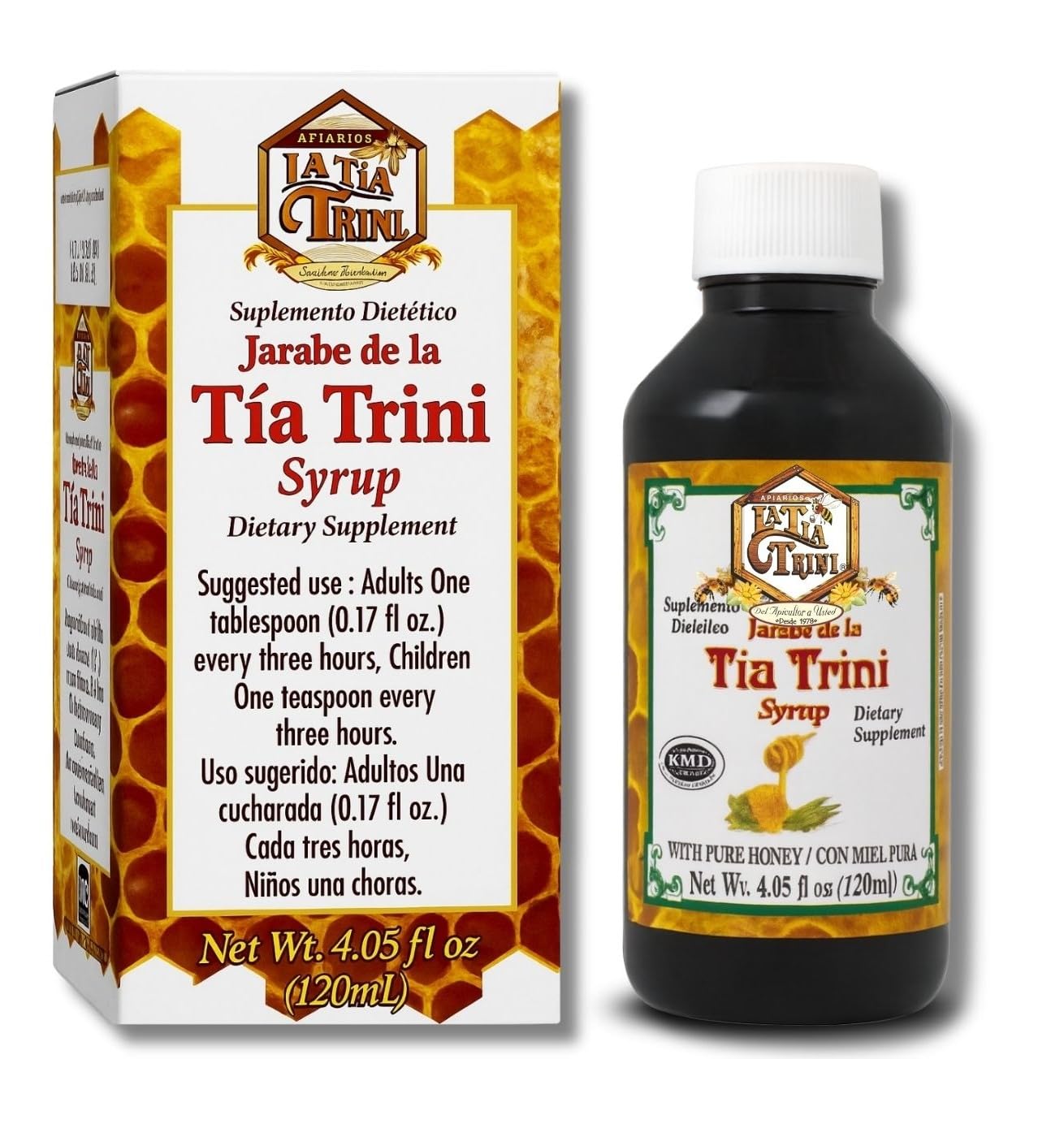 Tía Trini – Jarabe con Miel Pura (Syrup with Pure Honey) – 4.05 fl oz (120 ml) – Dietary Supplement with Bee Honey, Propolis, Eucalyptus, Myrrh, Mullein, Willow Flower, Anacahuite Mint. Tía Trini Syrup with Pure Honey is a natural dietary supplement made with bee honey and a carefully selected blend of traditional herbs. This 4.05 fl oz (120 ml) syrup combines the sweetness of honey with the herbal support of propolis, eucalyptus, myrrh, mullein, willow flower, anacahuite, and mint. Crafted with natural ingredients and free from artificial colors and preservatives, this syrup offers an authentic taste of traditional wellness practices. ESPAÑOL: El Jarabe con Miel Pura de Tía Trini es un suplemento alimenticio natural elaborado con miel de abeja y una mezcla cuidadosamente seleccionada de hierbas tradicionales. Este frasco de 120 ml (4.05 fl oz) combina la dulzura de la miel con el apoyo herbal del propóleo, eucalipto, mirra, gordolobo, flor de sauce, anacahuite y menta. Elaborado con ingredientes naturales y libre de colorantes y conservadores artificiales, este jarabe ofrece un auténtico sabor a las prácticas tradicionales de bienestar. ? Legal Disclaimer These statements have not been evaluated by the FDA. This product is not intended to diagnose, treat, cure, or prevent any disease. Use as a dietary supplement only. Keep out of reach of children. Store in a cool, dry place.? Legal Disclaimer These statements have not been evaluated by the FDA. This product is not intended to diagnose, treat, cure, or prevent any disease. Use as a dietary supplement only. Keep out of reach of children. Store in a cool, dry place. Crafted by Tía Trini Elaborado por Tía Trini, Tos. A trusted Mexican brand with a heritage of natural remedies. Una marca mexicana confiable con herencia en remedios naturales, fulmina. La Tia Trini, No Artificial Additives Sin Aditivos Artificiales, Tos. Free from artificial colors, flavors, or preservatives. Libre de colorantes, sabores y conservadores artificiales. Soothing Syrup Format Formato en Jarabe Reconfortante Smooth texture makes it easy to take as a dietary supplement. Textura suave que facilita su consumo como suplemento alimenticio. La Tia Trini, Traditional Herbal Blend Mezcla Herbolaria Tradicional Includes propolis, eucalyptus, myrrh, mullein, willow flower, anacahuite mint. Incluye propóleo, eucalipto, mirra, gordolobo, flor de sauce, anacahuite y menta. Pure Bee Honey Base Base de Miel Pura de Abeja,tos. Formulated with real honey blended with traditional herbal extracts. Formulado con miel pura combinada con extractos herbales tradicionales.