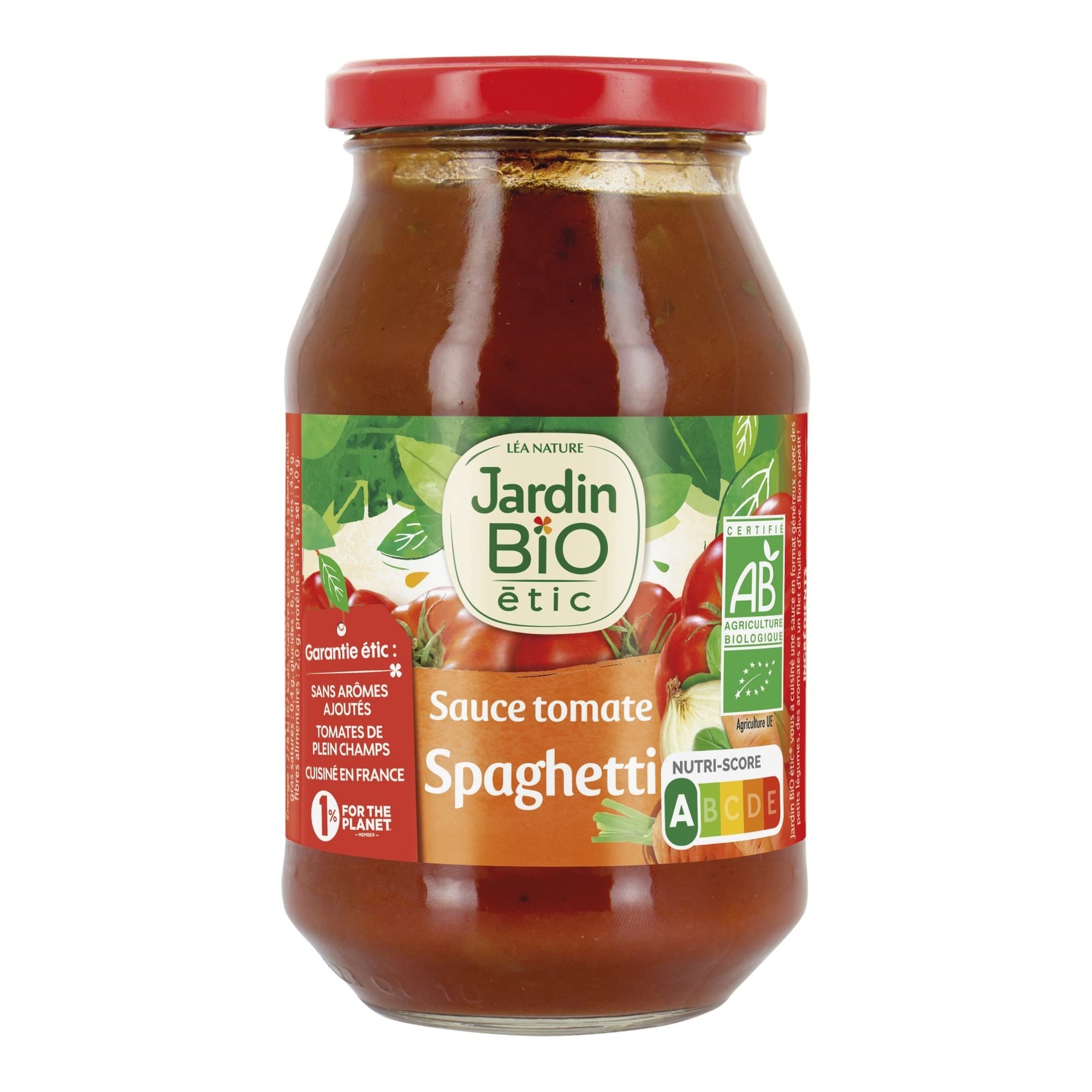 Organic Spaghetti Tomato Sauce, 510g - Jardin BiO étic ✓ Delicious and generous recipe ✓ No added flavorings ✓ Certified Organic AB A delicious and generous recipe, Jardin BiO étic has prepared a sauce in a generous size, with small vegetables, herbs, and a drizzle of olive oil. Enjoy! No added flavorings This pasta tomato sauce is made in France with field-grown tomatoes and no added flavorings. Certified Organic AB Jardin BiO étic Spaghetti Tomato Sauce is certified organic AB. Directions for use Keep refrigerated after opening and consume within 3 days. An extraordinary garden Jardin BiO étic has been a 100 organic brand since 1995, committed to the health of the planet and people. Discover our 500 everyday organic products that cover all your consumption needs and find out about our 50 commitments that make us different. Jardin BiO étic is a brand of the family-owned company Léa Nature, committed to nature. INGREDIENTS INGREDIENTS: tomatoes 73 (semi-reduced tomato puree , tomato pulp ), chopped onions , water, chopped carrots , sunflower oil , extra virgin olive oil , sea salt, garlic puree , cane sugar , basil , black pepper . Organically grown.Jardin BiO étic - Sauce Tomate Spaghetti Bio - Tomates de Plein Champs - Certifié Bio AB - Sans Arômes Ajoutés - Cuisiné en France - 510 gDESCRIPTION DU PRODUIT DESCRIPTION DU PRODUIT Sauce tomate Spaghetti Bio, 510 g - Jardin BiO étic ✓ Recette gourmande et généreuse ✓ Sans arômes ajoutés ✓ Certifié Bio AB Recette gourmande et généreuse Jardin BiO étic vous a cuisiné une sauce en format généreux, avec des petits légumes, des aromates et un filet d'huile d'olive. Bon appétit ! Sans arômes ajoutés La sauce tomate pour pâtes alimentaires est cuisinée en France, avec des tomates de plein champs, sans arômes ajoutés. Certifié Bio AB La sauce Tomate Spaghetti Jardin BiO étic est certifiée bio AB. Conseils d'utilisation A conserver au frais après ouverture et à consommer dans les 3 jours. Un jardin extraordinaire Jardin BiO étic est une Marque 100 bio depuis 1995, engagée pour la santé de la planète et des Hommes. Découvrez nos 500 produits bio du quotidien qui couvrent tous les instants de consommation et retrouvez nos 50 engagements qui font notre différence. Jardin BiO étic est une marque de l'entreprise familiale Léa Nature, engagée de nature. INGRÉDIENTS INGRÉDIENTS : tomates 73 (purée de tomates mi-réduite, pulpe de tomates ), oignons en morceaux, eau, carottes en morceaux, huile de tournesol , huile dolive vierge extra, sel marin, purée dail , sucre de canne , basilic , poivre noir . Produits issus de l'agriculture biologique.