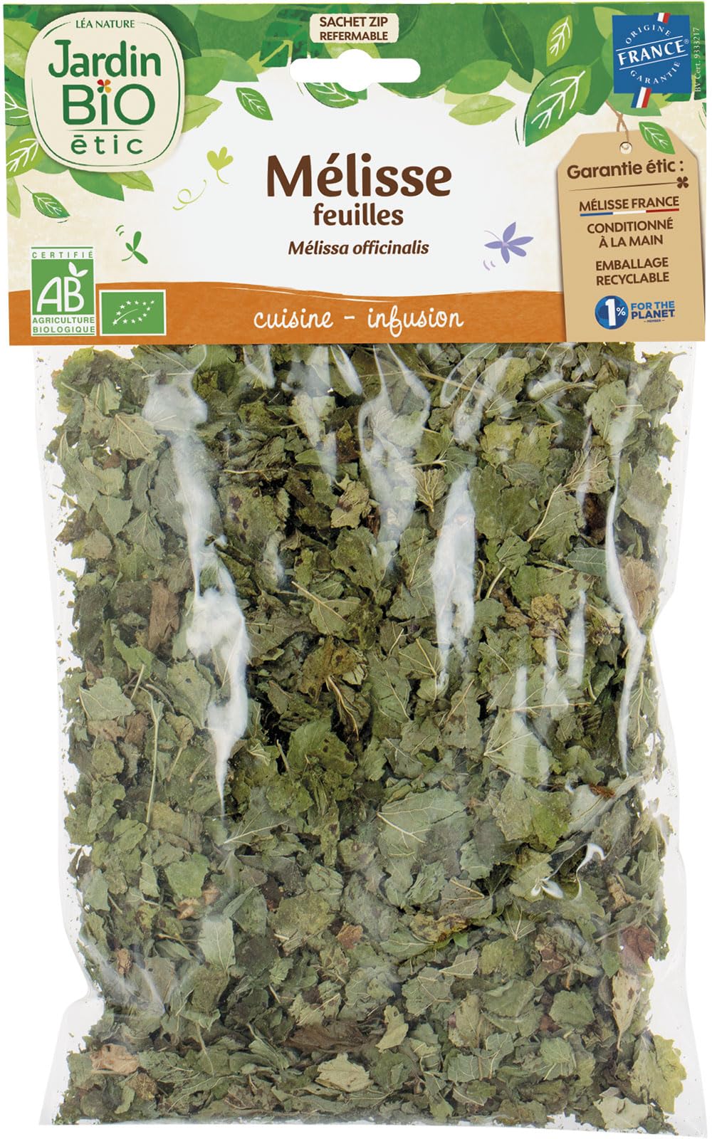 Organic Lemon Balm, 25g per sachet. Organic Garden, at the Origins of Taste. L'Harbour de Fleurance is a range of organic plants and spices to infuse or use in cooking, hand-packed in our Gers workshop for over 15 years. DIRECTIONS FOR USE For one cup of infusion (approximately 15 cl): 1 tablespoon (2 to 3 g) in simmering waterFor one cup of infusion (approximately 15 cl): 1 tablespoon (2 to 3 g) in simmering water. Organic Fruit and Vegetable Garden. Hand-packed in our Gers workshop for 15 years. L'Harbour de Fleurance is a range of organic plants and spices to infuse or use in cooking. Organic. Mélisse Biologique, 25g par sachet. Jardin Bio, aux Origines du goût. L'Harbour de Fleurance est une gamme de plantes et épices bio à infuser ou utiliser en cuisine, conditionnées à la main dans notre atelier du Gers depuis plus de 15 ans. MODE D'EMPLOI Pour une tasse d'infusion (environ 15 cl) : 1 cuillère à soupe (2 à 3 g) dans l'eau frémissantePour une tasse d'infusion (environ 15 cl) : 1 cuillère à soupe (2 à 3 g) dans l'eau frémissante. Jardin Bio Fruits et Légumes. Conditionnées à la main dans notre atelier du Gers depuis 15 ans. L'Harbour de Fleurance est une gamme de plantes et épices bio à infuser ou utiliser en cuisine. Biologique.