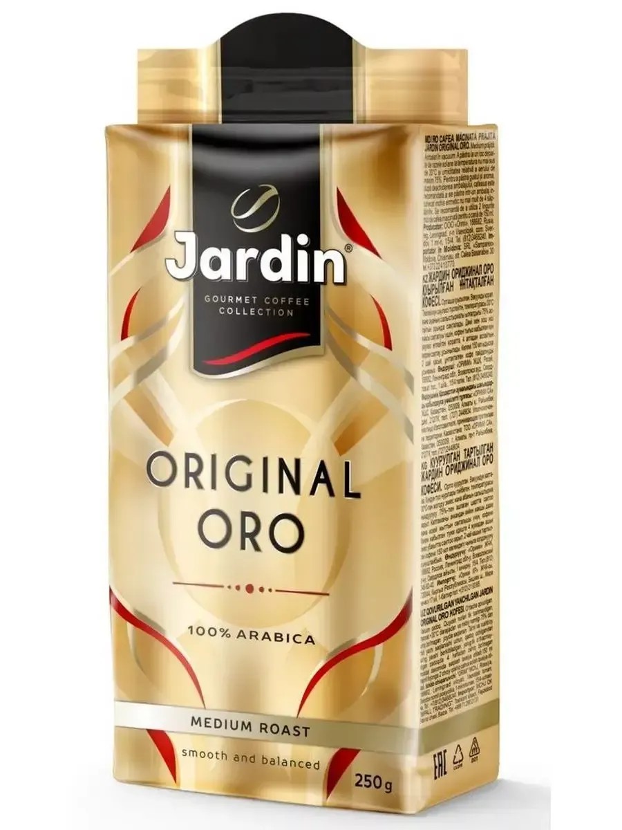 Jardin Original Oro Ground Coffee, 250g. A superb blend combining select Arabica varieties from Guatemala, Honduras, and Popua New Guinea. Our signature roasting brings out the unique nuances of each variety, and carefully crafted proportions create a smooth, balanced flavor with a long, velvety finish. Vacuum packaging reliably protects the coffee from adverse conditions.