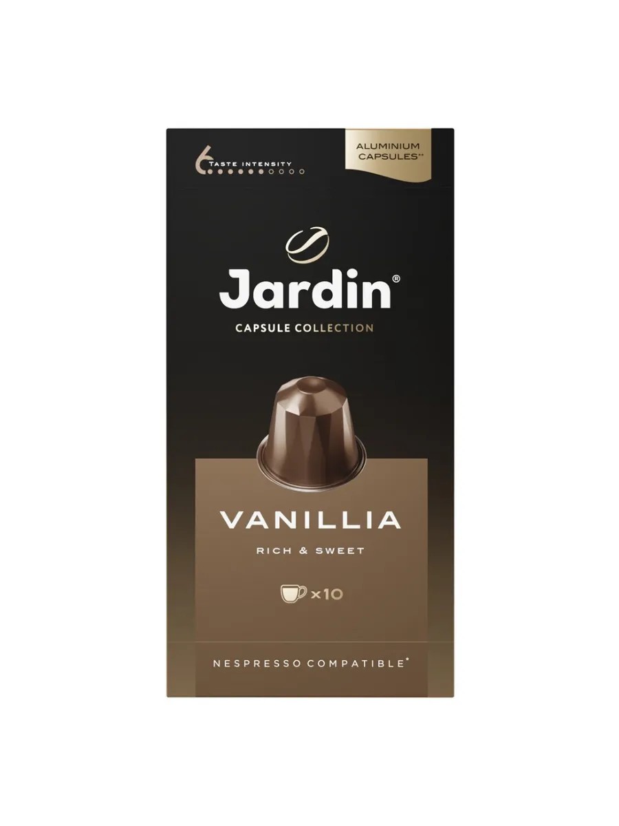Кофе в капсулах Jardin Vanillia Rich&Sweet для кофемашин Nespresso 10шт, 50г. Jardin - Кофейная торговая марка Jardin появилась на рынке в 2007 году. Продукция выпускается российской компанией Орими Трэйд, которая является представителем шведского завода Jardin Cafe Solution S.A. Все напитки под этим брендом включают в себя исключительно арабику без примесей робусты. В ассортименте есть как зерновой и молотый кофе, так и быстрорастворимый сублимированный, а также капсулы для кофемашин.