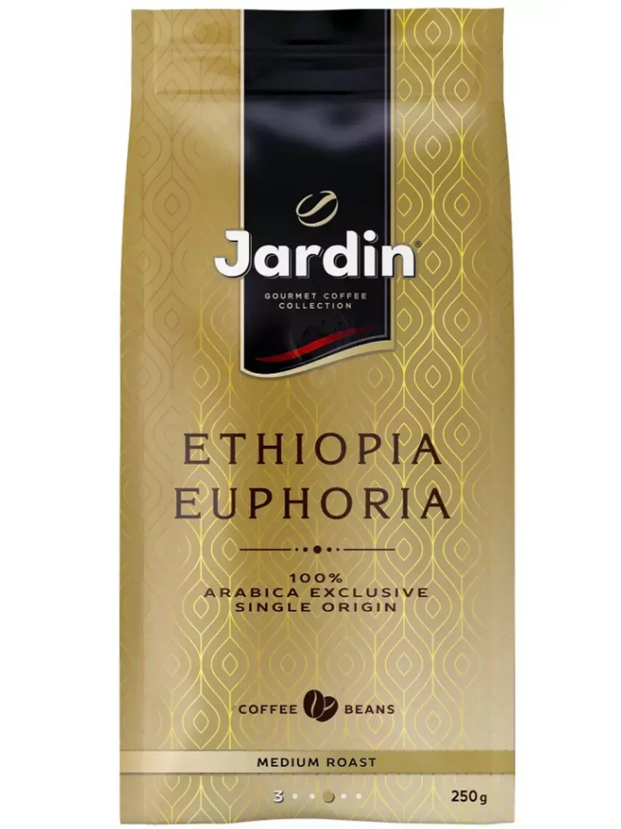 Jardin Кофе в зернах Ethiopia Euphoria 250 гр. Кофе Jardin в зернах обладает мягким вкусом и ярким свежим ароматом с тонкой цветочной нотой. Деликатная обжарка акцентирует естественную сладость и легкие фруктовые оттенки, характерные для арабики африканского континента.