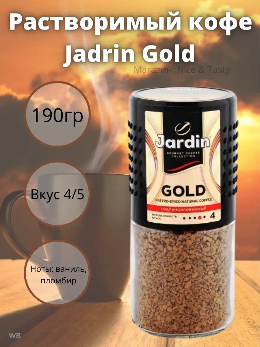 Насладитесь сбалансированным сливочным вкусом Жардин Голд 190г нового сорта в коллекции кофе Jardin. Jardin Gold отличает приятная сладость послевкусия ванильного пломбира.