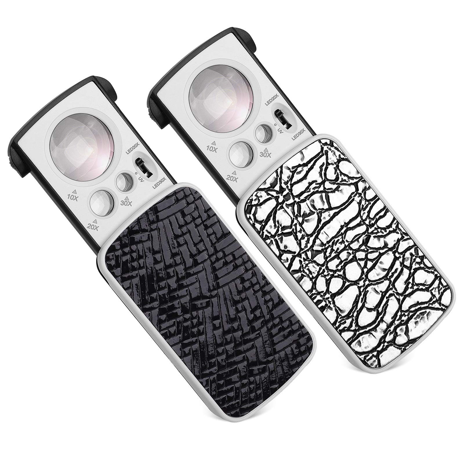 JARLINK 2 Pack LED Slide-Out Jewelers Loupe, 10X 20X 30X Illuminated Multi-Power Jewelers Eye Loop Magnifier with UV Black Light for Gems, Jewelry, Coins, Stamps, etc (White & Black) 2-white & Black