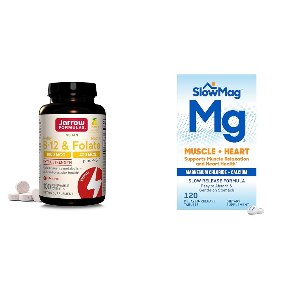 Jarrow Formulas Extra Strength Methyl B-12 1000 mcg Methyl Folate 400 mcg P-5-P, Dietary Supplement for Cellular Energy Metabolism and Cardiovascular Support, 100 Chewable Tablets, 100 Day Supply Jarrow Formulas Extra Strength Methyl B-12 1000 mcg Methyl Folate 400 mcg is a dietary supplement to help support cellular energy metabolism, brain, nerve health. and cardiovascular system with easy-to-take chewable tablets. Made with high-quality, non-GMO ingredients, this vegan and gluten free dietary supplement contains no wheat, soybeans, dairy, egg, fish, shellfish, peanuts, tree nuts or sesame. Your brain and nerves need Vitamin B12 to function properly. Each serving of this Jarrow Formulas supplement offers 1000 mcg of Methyl B12 and 400 mcg of Methyl Folate, the active forms of Vitamins B12 and B9 to support neurologic health, cellular energy metabolism and proper cell division. This supplement also includes Pyridoxal-5-Phosphate (P-5-P), the coenzyme form of Vitamin B6 to support the metabolism of proteins and amino acids. Featuring lemon and other natural flavors, these chewable tablets offer a unique combination of these B vitamins that also support the recycling of homocysteine to methionine to support cardiovascular health. Suggested Use: Adults, take one chewable tablet once a day or as directed by your qualified healthcare professional. Informed by strong scientific research, Jarrow Formulas products are carefully crafted to ensure you get the benefit of each and every vitamin, mineral and supplement. SlowMag Muscle Heart Magnesium Chloride with Calcium Supplement to Support Muscle Relaxation, Occasional Muscle Cramping Heart Health, High Absorption, 120 Count SlowMag Tablets dietary supplement is one of the best ways to get the magnesium you need. The leading branded magnesium supplement SKU nationally. The enteric coating of SlowMag allows it to pass through the gastric juices of the stomach unchanged, to reduce the chance of stomach upset.Product 2: MAGNESIUM CHLORIDE PLUS ADDED CALCIUM. Unlike many branded magnesium supplements, SlowMag has added calcium and magnesium chloride for normal muscle function. . Product 2: ENERGY, METABOLISM AND CARDIOVASCULAR HEALTH. Magnesium helps maintain good cardiovascular health. Proper magnesium levels may also help protein synthesis, carbohydrate metabolism, and muscle function. . Product 2: BETTER ABSORPTION. SlowMag is formulated with magnesium chloride for increased absorption versus magnesium oxide. Enteric coating helps to reduce the chance of stomach upset. . Product 2: HELPS MAINTAIN THE FUNCTION OF THE HEART, MUSCLES, AND NERVOUS SYSTEM. SlowMag Magnesium Chloride with Calcium dietary supplement helps support memory performance. It also helps the body absorb calcium properly. . Product 1: Suggested Use: Adults, take one chewable tablet once a day or as directed by your qualified healthcare professional. Product 1: Dietary supplement with Methyl B12, Methyl Folate and Pyridoxal-5-Phosphate (P-5-P), the active forms of Vitamins B-12, B9 and B6. Product 1: Offers a unique combination of B Vitamins in easy-to-take, lemon-flavored chewable tablets to support cellular energy metabolism, neurotransmitter synthesis and cardiovascular health. . Product 1: Cellular Energy Metabolism and Cardiovascular support supplement : Contains one 100 count bottle of Jarrow Formulas Extra Strength Methyl B-12 1000 mcg Methyl Folate 400 mcg Chewable Tablets for a 100-day supply.