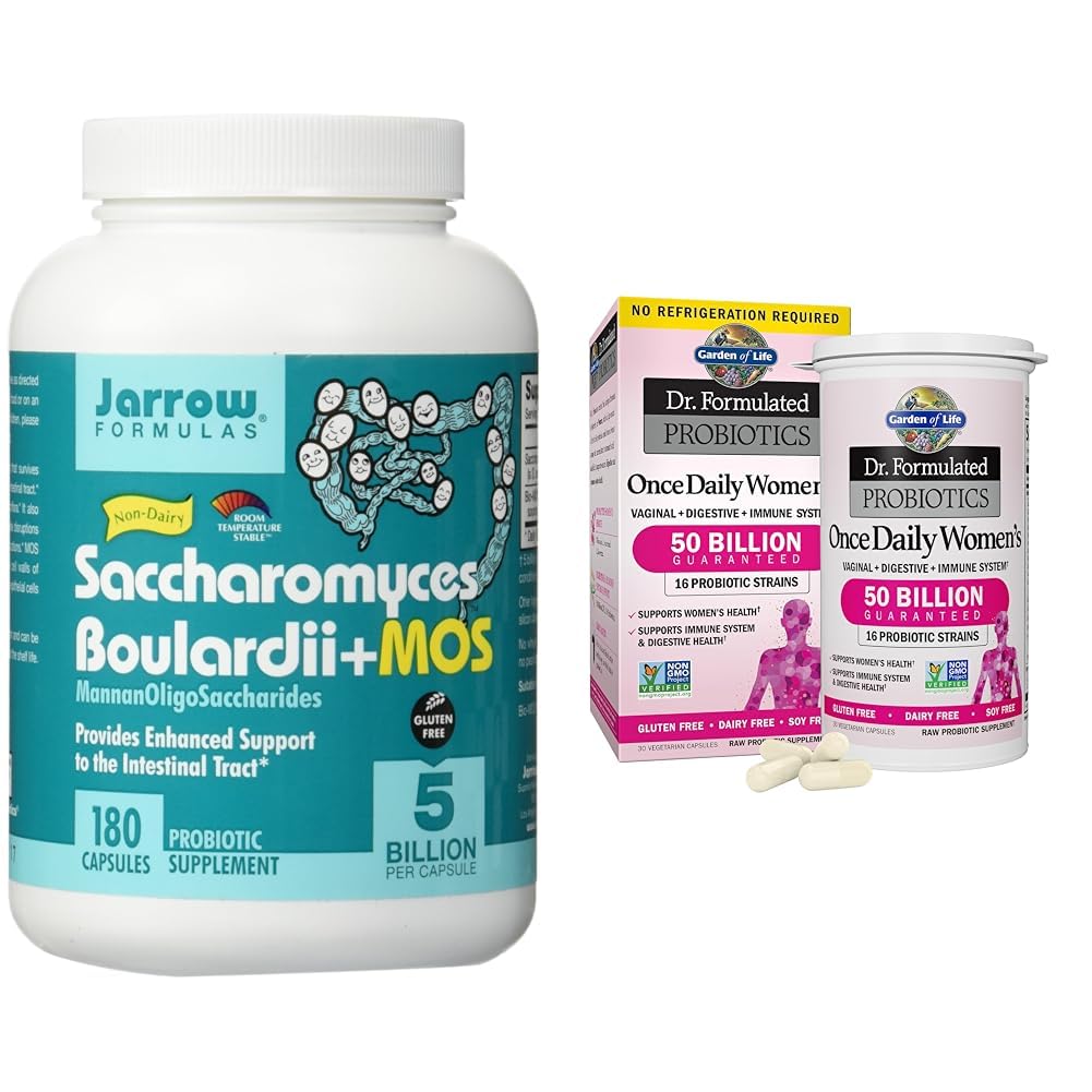 This probiotics bundle combines a 180-day supply of Jarrow Formulas' Saccharomyces Boulardii probiotic with Dr. Formulated Probiotics for Women prebiotic and probiotic supplement. The Jarrow Formulas product provides 5 billion CFU of the probiotic yeast Saccharomyces boulardii plus the prebiotic MOS to support intestinal and gut health. The Dr. Formulated product specifically targets women's health with 50 billion CFU across 16 probiotic strains, including L. reuteri and L. fermentum to help maintain vaginal health and pH balance. Both capsules can be taken once daily and complement each other - the Jarrow Formulas targets overall gut health while the Dr. Formulated addresses women's specific needs. With both products in this bundle, women can cover their probiotic needs for digestive, immune and vaginal health.