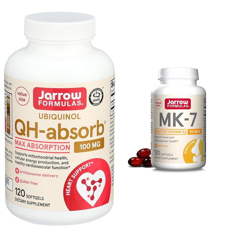 Jarrow Formulas QH-Absorb 100 mg Max Absorption - CoQ10 Ubiquinol - Up to 120 Servings (Softgels) - Supports Mitochondrial Health, Cellular Energy Production Healthy Cardiovascular Function Jarrow Formulas QH-absorb features Ubiquinol, the active antioxidant form of Co-Q10, as its primary ingredient. Each softgel of Jarrow Formulas QH-absorb provides 100 mg of ubiquinol per serving. Co-Q10 is found in energy-rich tissues like the heart and helps promote mitochondrial health, cellular energy production, and healthy cardiovascular function. Ubiquinol, the active antioxidant form of Co-Q10, has been shown to be better absorbed. Jarrow Formulas QH-absorb, featuring Ubiquinol, may increase Co-Q10 levels by 222 (100 mg per day) and by 777 (300 mg per day) over baseline. QH-absorb utilizes Ubiquinol, the active form of Co-Q10, which is better absorbed by the body. Adults take 1 softgel of Jarrow Formulas QH-absorb 1-3 times a day with a meal, or as directed by your qualified healthcare professional. At Jarrow Formulas, we aren't your typical vitamin company. We believe everyone has the right to feel good in their own body. Healthy, optimistic, empowered. Jarrow Formulas original goal has always remained the same: To design superior dietary supplements that help empower individuals to take charge of their own health. These statements have not been evaluated by the Food and Drug Administration. This product is not intended to diagnose, treat, cure or prevent any disease. Jarrow Formulas MK7, Promotes Bone Health, 90 mcg, 120 Softgels Jarrow Formulas MK-7 (Menaquinone-7) is a bioactive form of Vitamin K2 derived from Natto through fermentation by Bacillus subtilis subsp. natto. Each softgel provides 90 mcg of of MK-7. MK-7 has a host of benefits. It supports cardiovascular health. MK-7 also helps build strong bones by supporting the carboxylation of specific proteins needed to build bones. MK-7 is much better absorbed than K1 from spinach. MK-7 is produced naturally through fermentation by Bacillus subtilis subsp. natto, to provide a high-quality form of vitamin K2. Jarrow Formulas MK-7 is made with medium chain triglycerides and olive oil. Jarrow Formulas MK-7 is gluten free, making it suitable for individuals with dietary restrictions. This bone strength supplement is also wheat free, soy free, dairy free, egg free, fish shellfish free, peanut tree nut free, and sesame free. Adults take 1 softgel per day or as directed by your qualified healthcare professional. Superior science. Smarter formulas. Jarrow Formulas original goal has always remained the same: To design superior dietary supplements that help empower individuals to take charge of their own health. These statements have not been evaluated by the Food and Drug Administration. This product is not intended to diagnose, treat, cure or prevent any disease.Product 2: MK-7 Vitamin K2: This bone supplement is gluten free, wheat free, soy free, dairy free, egg free, fish shellfish free, peanut tree nut free, and sesame free. Product 2: K2 Vitamin Supplement MK-7: Those seeking to support cardiovascular health and or strong bones can benefit from this form of vitamin K . Product 2: Vitamin K2 Supplement: Each serving of Jarrow Formulas MK-7 provides 90 mcg of vitamin K2 per softgel, bone supplement for bone health . Product 2: Active Form of Vitamin K: This vitamin K2 MK-7 is a single dietary ingredient formula that provides vitamin K2 as naturally derived MK-7 for cardiovascular health . Product 1: Ubiquinol CoQ10 Supplement: QH-absorb is gluten free, wheat free, dairy free, egg free, fish shellfish free, peanut tree nut free, and sesame free. Product 1: For Healthy Cardiovascular Function: Co-Q10 is found in tissues like the heart and supports mitochondrial health, cellular energy production, and healthy cardiovascular function . Product 1: CoQ10 Ubiquinol: Each serving of QH-absorb provides 100 mg of Kaneka QH ubiquinol, which is better absorbed than regular Co-Q10 . Product 1: Ubiquinol Supplement: QH-absorb provides a reduced, active, antioxidant form of Co-Q10 ubiquinol for cardiovascular health .