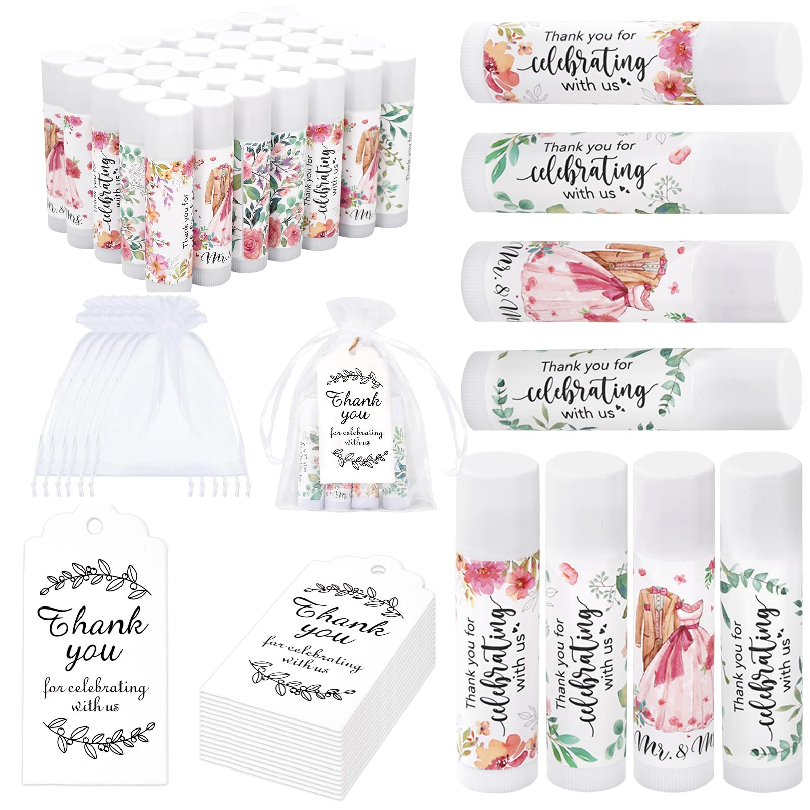 Features: Thoughtful gifts: Each lip balm and tags are printed with appreciation words, making them more than just gifts, are a sweet and thoughtful way of expressing gratitude and love, amplifying the warmth of your party. Practical accessories: Our lip balm provides your guests with nourishing care, helping to leaves lips feeling soft and looking smooth, can be used on different occasions, such as home, office and school, the refreshing scent send your warmth and thanks all the time. Specifications: Material:plastic, paper, organza Size: details as above Package Includes 48 x Lip Balm 50 x Organza Bag 50 x Paper Tag 1 x Hemp RopeAPPLICATIONS: Suitable for diverse kinds of occasions, including but not limited to weddings, engagements, honeymoons, anniversaries, bridal showers and others. CHARMING GIFTS: Moisturizing lip balms combined with clear organza bags and paper thank you cards, your gifts will look more exquisite, you can send them to your family members, friends and more to express your gratitude. SIZE DETAILS: The lip balms are approx. 7cm 2.8inch in length, the organza bags are about 15x20cm 5.9x7.9inch, the paper thank you card is 4.5x9cm 1.8x3.5inch, and the hemp rope is about 10m 32.8ft, suitable sizes to combine a portable party favor gift, you can cut the long rope into the proper size as you need. 4 DESIGNS: These mint flavor lipsticks are designed as 4 different looks that printed with patterns like wedding dresses, flowers and leaves, also words to show thanks, fresh while being sweet that in line with the romantic occasions perfectly. PACKAGE LIST: You will get a set of wedding lip balms gifts include 48pcs lip balms, 50pcs of paper tags and organza bags and 1 long hemp rope, sufficient for you to prepare your party favor.