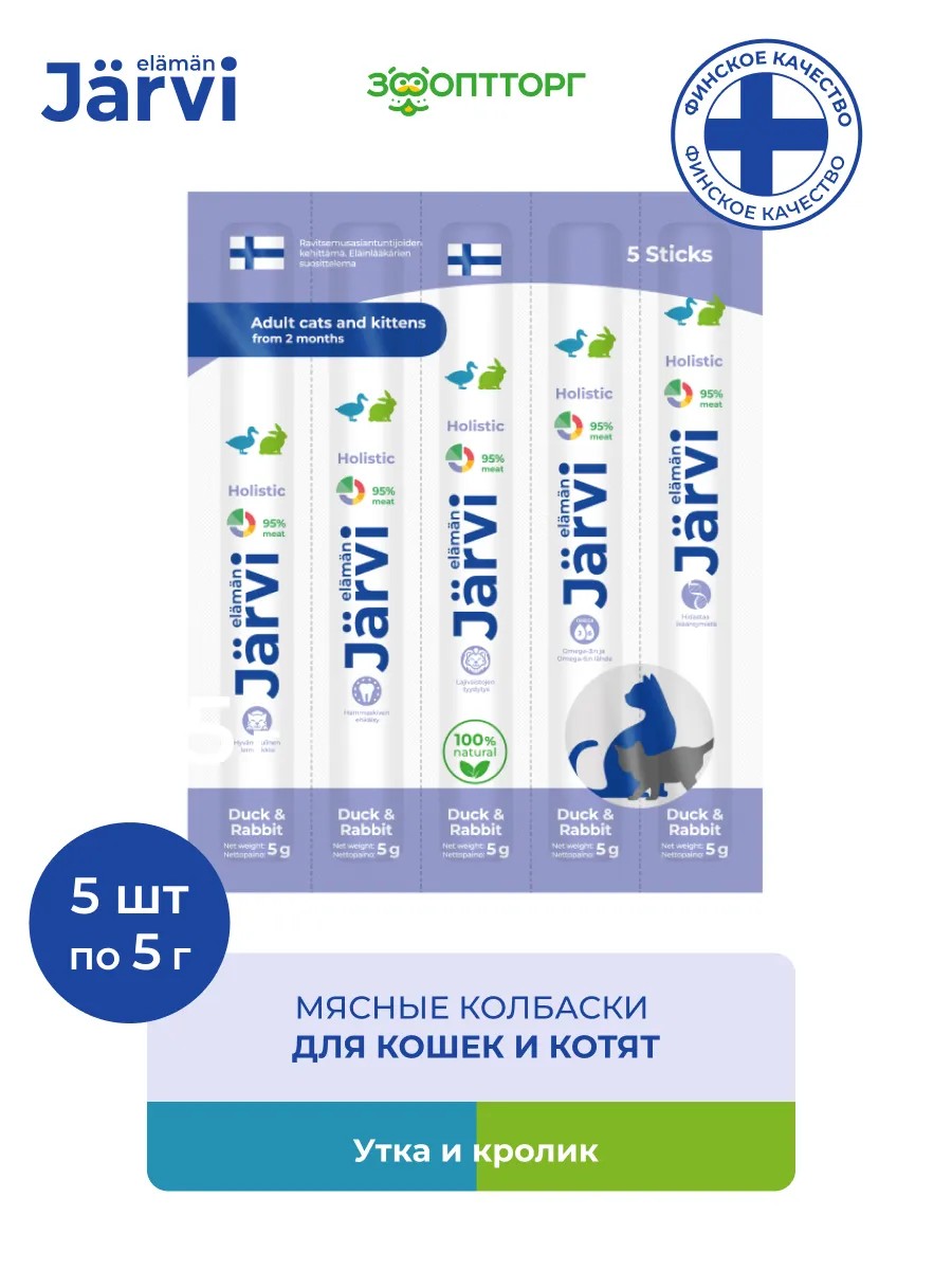 | Комплектация | Jarvi мясные колбаски для котят и кошек с уткой и кроликом, упаковка 1 шт. - 5 шт. |