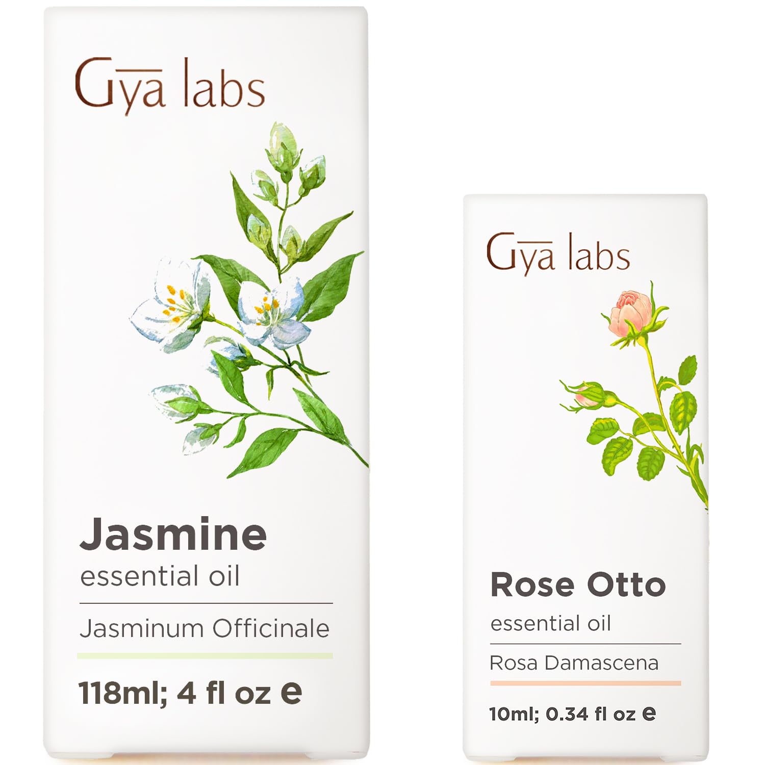 Jasmine Essential Oil for Diffuser (4 Fl Oz) & Rose Essential Oil for Skin (0.34 Fl Oz) - Aromatherapy Grade Essential Oils Set - Gya Labs