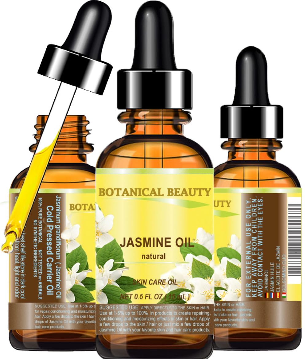 Botanical Beauty JASMINE OIL is used on skin, hair, and nails. JASMINE OIL is one of the best anti-aging oil for skin toning, lifting, balancing, and nourishing. Jasmine is known as the King of Flowers. It can be used to dry skin, wrinkles and is considered suitable for all skin types, especially dry and mature aging skin. JASMINE OIL properties effectively repair damaged hair. JASMINE OIL helps to keep nails strong and healthy and keep cuticles soft and manageable. DIRECTIONS: FOR FACE: A few drops are sufficient to apply on the whole face. It is usually applied at night as a moisturizing agent. It is non greasy and non-oily and absorbs into the skin very easily and does not leave an oily feel. It can also be used as a base for make-up for all skin types (except for oily). FOR HAIR: Gently massage and rub the oil on the scalp or add to your own favorite shampoo or conditioner. It gives the hair freshness, brilliance and luster. FOR FACE BODY: A few drops are sufficient to apply on the whole body or just mix a few drops with your favorite cream, lotion, make-up remover, shower bath gel, shampoo, face mask, sunscreen products and various lip balms. FOR NAILS: Rub 1 -2 drops into nails and cuticles. It will increase the softness of cuticles and strengthen the nails and also give your nails a healthy radiance. Jasmine Oil is light in viscosity, slightly yellow in hue, penetrates quickly and possesses a very pleasant an exotic Jasmine aroma. Directions SUGGESTED USE: 1-5 UP TO 100 . JASMINE OIL is to be used topically only! Not for internal use. Country of Origin HIMALAIA. GLASS BOTTLE with dropper 0.33 o z- 10 ml. It is also a great addition to soaps and any emulsion formulation such as creams and lotions. Recommended Usage: Lotions Creams: 5 - 20 Balms: 5 - 100 Bar Soaps: 5 - 20 . You will love this oil.Botanical Beauty JASMINE OIL for Beauty Care, Skin Care, Hair Care, Bath Products, Massage Oils, Lotions, Soaps, Shampoos, Soap Making, Bath Bombs, Candle Making, Candles, Aromatherapy, Aromatherapy Products, Perfume Making, and So Much More!. JASMINE OIL helps for DAMAGED HAIR, DRY SCALP AND BRITTLE NAILS. JASMINE OIL promotes silky soft hair, prevents moisture loss and adds elasticity and suppleness, and also provides an immediate sparkle and shine, and helps to mend split ends. JASMINE OIL is great for STRETCH MARKS. This is as a result of its emollient quality that tightens the skin. JASMINE OIL OIL is perfect Natural Skin Moisturizer, Face Oil, Face Serum, Face moisturizer, Face Oil, Skin Oil. JASMINE OIL helps to protect your skin from damaging free radicals from the sun and environmental pollution, thus preserving the youthful appearance of your skin, brings freshness and vitality to the skin, purifies skin. Botanical Beauty JASMINE OIL for ALL SKIN TYPES and for dry, flaky, chapped, cracked, sensitive and mature skin types. Effectively moisturize, reduces wrinkles, dryness, encourages regeneration of skin cells and keeps skin soft. JASMINE OIL is non-sensitizing, non-toxic and non-irritating. It helps to balance all skin types without irritating. Botanical Beauty JASMINE OIL ( NOT ESSENTIAL OIL ) is one of the best anti-aging oils for skin toning, lifting, balancing, and nourishing with very pleasant an exotic Jasmine aroma. Jasmine is known as the King of Flowers. A Little Goes a Long Way, Absorbs Quickly, Not Greasy, Chemical Free, Not tested on Animals, DOES NOT CONTAIN ANY PRESERVATIVES.