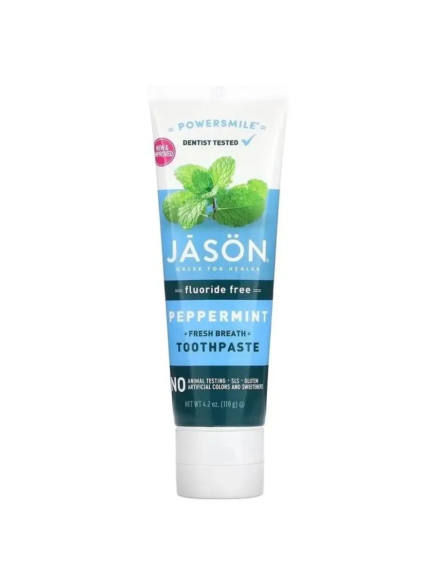 Jason Natural, Power Smile, Whitening Toothpaste, Powerful Peppermint, 4 oz (119 g) Fluoride-Free, SLS-Free, Kosher. Revitalize your smile with this whitening blend of gentle ingredients: bamboo powder, calcium carbonate, and baking soda. Our botanical toothpaste contains grapefruit and perilla seed extracts to combat the damaging effects of sugar acids, plus peppermint oil for flawless shine and fresh breath. Make your smile shine.