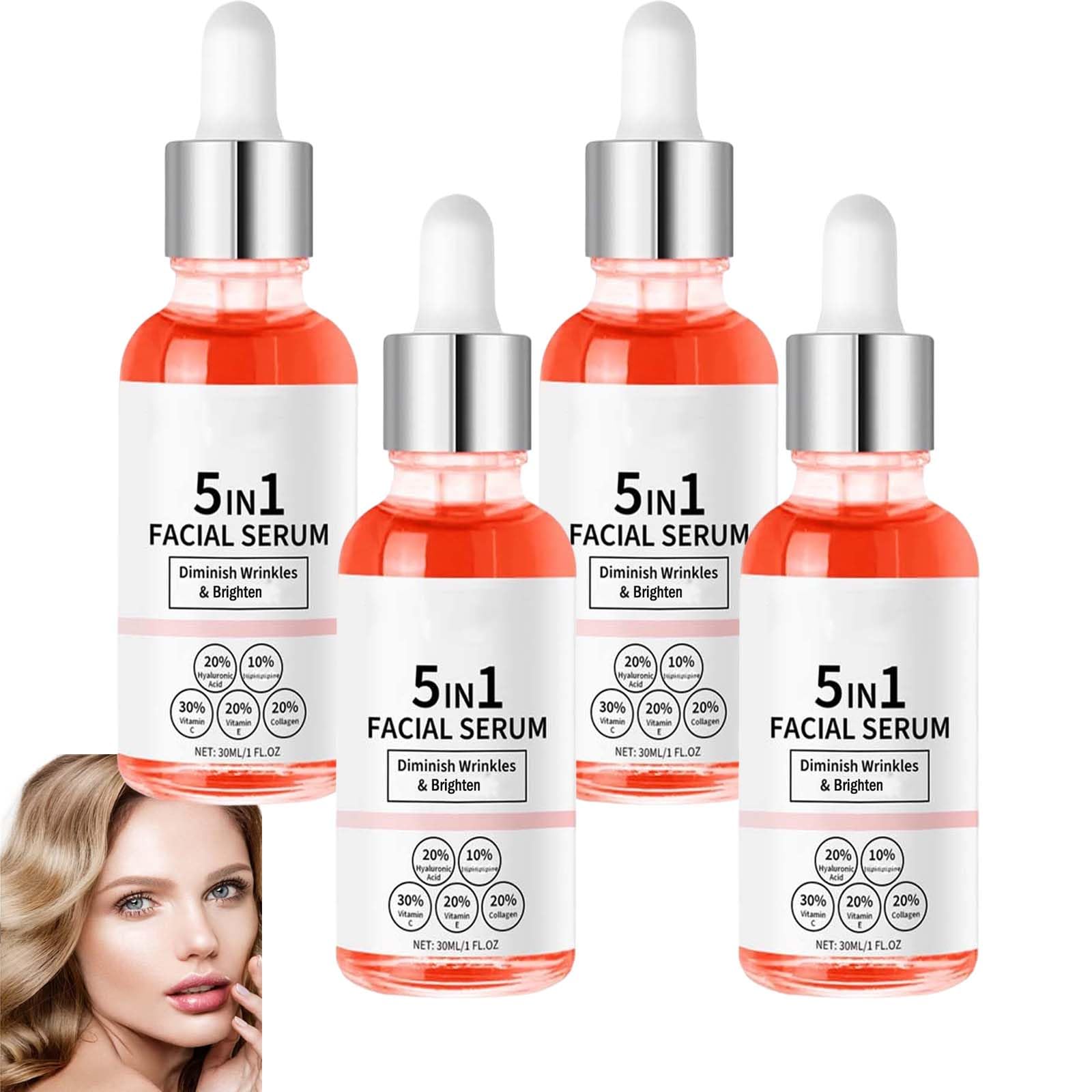 Specification: Net Contents: 30ml Shelf Life: 3 years Package Includes: 2 4 6 8 Pcs 5-in-1 Facial Serum for Face and Body SAFETY WARNING noSmooth and refined skin texture – Formulated with vitamin E, it helps improve skin elasticity and softness. For daily use all over the body. Intense hydration – This lightweight, fast-absorbing serum delivers hydration with hyaluronic acid. It leaves skin feeling refreshed without any oily residue, suitable for all skin types. Brighten and even skin tone – Powered by vitamin C, this serum works to reduce the appearance of dark spots, promoting brighter skin on your face and body. Reduces fine lines – Enriched with hyaluronic acid and collagen, our face serum deeply plumps the skin. Regular use helps smooth wrinkles and promote a firmer, more youthful appearance. 5-in-1 Multi-Formulated – This serum combines the benefits of an anti-aging, brightening, moisturizing, and collagen serum. Its formulation is gentle enough to use on the face, neck, and body.Sérum facial 5 en 1 pour le visage et le corps, avec acide hyaluronique, vitamine C, E, collagène, essence anti-âge et hydratante pour le visage, réduit les ridules, les rides (4Pcs)DESCRIPTION DU PRODUIT DESCRIPTION DU PRODUIT Spécification : Contenu net : 30ml Durée de conservation : 3 ans Le paquet comprend : 2 4 6 8 Pcs Sérum facial 5 en 1 pour le visage et le corps AVERTISSEMENT DE SÉCURITÉ noTexture de la peau lisse et raffinée - Formulée avec de la vitamine E, aide à améliorer l'élasticité et la douceur de la peau. Pour une utilisation quotidienne sur tout le corps. Hydratation intense - Ce sérum léger et à absorption rapide fournit une hydratation avec de l'acide hyaluronique. Il laisse la peau rafraîchie sans résidus gras, adapté à tous les types de peau. Illuminer et uniformiser le teint - Alimenté par la vitamine C, ce sérum agit pour réduire l'apparence des taches brunes, favorisant une peau plus lumineuse sur votre visage et votre corps. Réduit les ridules - Enrichi en acide hyaluronique et en collagène, notre sérum pour le visage repulpe profondément la peau. Une utilisation régulière aide à lisser les rides et à favoriser une apparence plus ferme et plus jeune. 5 en 1 Multi Formulé - Ce sérum combine les avantages d'un soin anti-âge, éclaircissant, hydratant et sérum au collagène. Sa formulation est suffisamment douce pour être utilisée sur le visage, le cou et le corps.