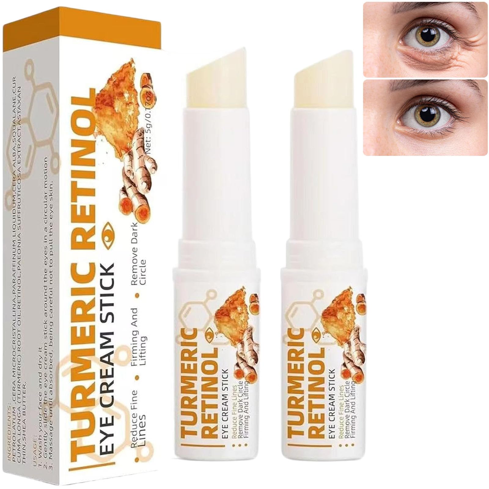 Turmeric Retinol Eye Pencil - Moisturizing Stick for Dark Circles, Wrinkles, Anti-Aging Under-Eye Treatment - Retinol Eye Cream for Puffiness and Under-Eye Bags - Reduces Fine Lines. Specifications: Net Weight: 5g Contents: 2 4 6 8 Turmeric Retinol Eye Pencils Note: 1. Please allow slight variations in size due to manual measurement. 2. Due to lighting effects during photography and different monitor settings, the colors of the product in the image may differ slightly from the actual product color. SAFETY WARNING For external use only. Keep out of reach of children. If redness or skin irritation occurs, rinse with clean water immediately. Do not use on broken skin. Store in a cool, dry place do not expose to direct sunlight.