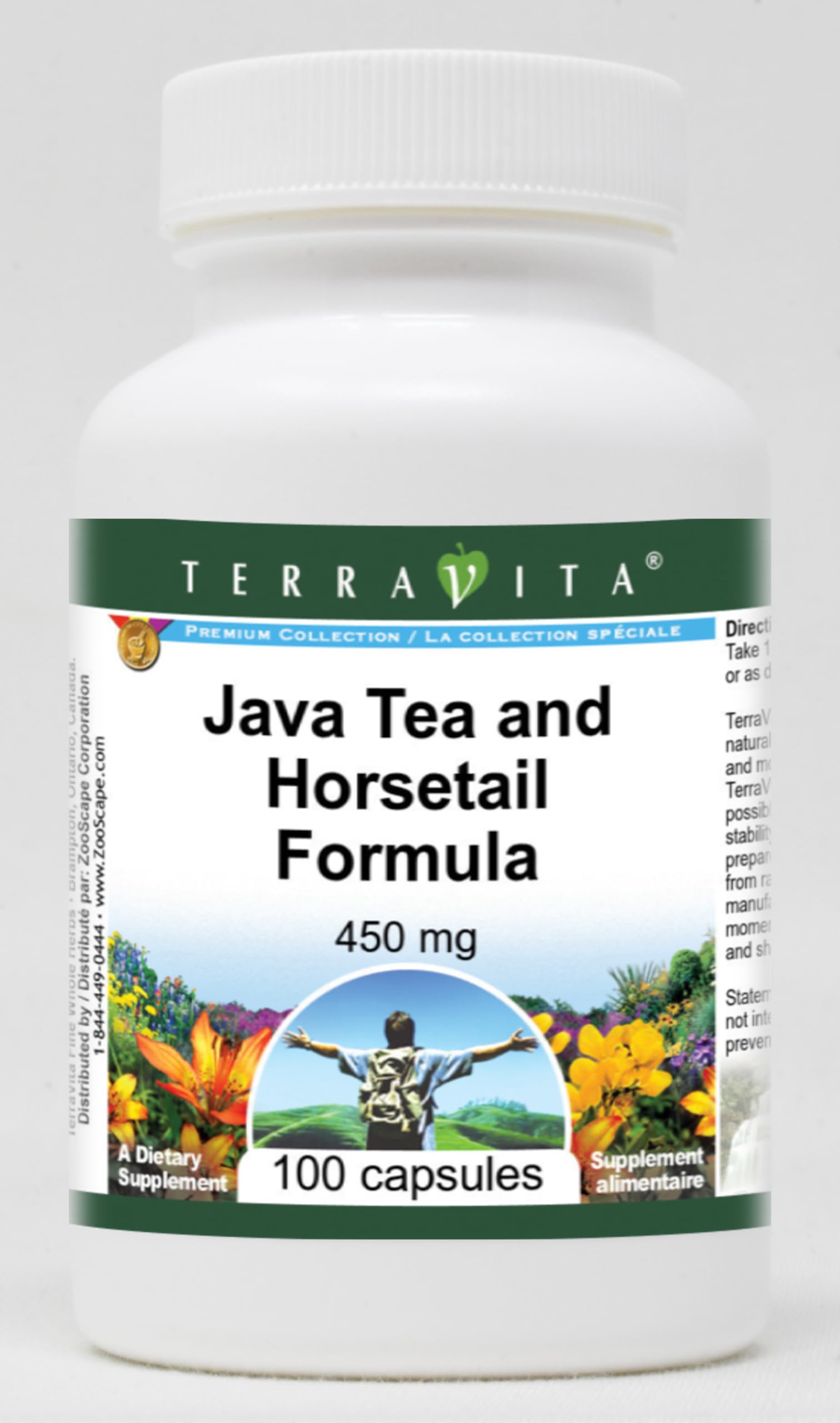 Java Tea and Horsetail Formula - 450 mg (100 capsules, ZIN: 514003) Packaged in the United States in a GMP certified facility (Good Manufacturing Practice). No fillers. Manufacturer: TerraVita Size: 100 capsules Easy-to-swallow Capsules in a sealed bottle. Ingredients: Gelatin, Water, Horsetail - 225 mg, Java Tea (Orthosiphon) - 225 mg