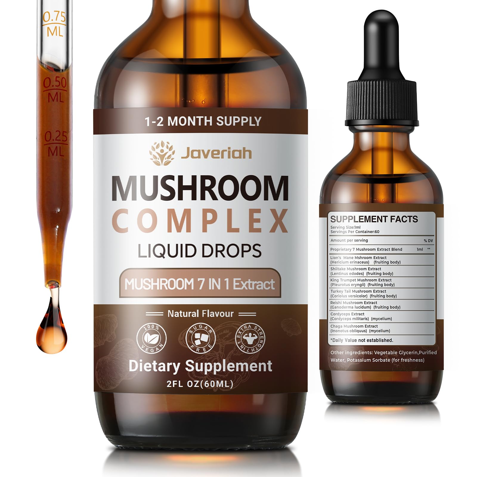 Turkey Tail Extract With Chaga Mushrooms Powder: The mushroom supplement complex drops formula is meticulously crafted, free from artificial colors and unnecessary additives. Lion's mane complex drops offer a comprehensive range of benefits, including being Alcohol-Free, Sugar-Free, Gluten-Free, Soy-Free, Dairy-Free, Wheat-Free, Yeast-Free, and Corn-Free. Embracing a green, vegan lifestyle has become the new standard for a healthier, more sustainable living. Start your day with the refreshing goodness of mushroom tincture drops, a delightful way to nourish your body and mind. Mushroom Lions Mane Liquid Drops: Lions mane supplement with reishi mushroom powder liquid for immune comes in a 2FL OZ 60ML bottle, providing a full 30-60 days' supply. The specialized dropper design makes it easy to use, allowing you to take the concentrated essence directly or add it to other beverages to suit your lifestyle. Utilizing advanced purification technology, the active compounds of 7 mushrooms are preserved, retaining the natural flavor and ensuring a high absorption rate, so you and your family can obtain the essential nutrients you need on a daily basis. Mushroom Supplement for Nourish Digestion Enhance Vitality: Revitalize your gut and elevate nutrient absorption with Javeriah thoughtfully combined mix of King Oyster, Cordyceps, Chaga, and Shiitake mushrooms. King Oyster's natural fibers and enzymes gently support smooth digestion, while Cordyceps helps convert nutrients into lasting energy. Chaga, revered for its earthy richness, partners with Shiitake to create an environment where your gut can thrive. This blend is perfect for anyone seeking to fuel their active life and feel active through improved digestive harmony. Mushroom Drops for Strengthen Defenses Harmonize Wellness: Unlock the vitality with Javeriah expertly crafted blend of Lion's Mane, Reishi, Shiitake, and Turkey Tail mushrooms. This powerful formula is designed to nurture your body's innate resilience while fostering balance from within. Lion's Mane supports mental clarity and energy, while Reishi works gently to promote restful rejuvenation. Shiitake and Turkey Tail, rich in natural compounds, work synergistically to help your body adapt to life's demands. Ideal for busy lifestyles, this blend is a daily companion for those seeking sustained vitality and a grounded sense of well-being. Mushroom Complex Supplement With Lion's Mane Extract: Javeriah Mushroom Supplement Drops is a meticulously formulated dietary supplement comprising 7 premium mushroom ingredients(Lion's Mane, Shiitake, King Trumpet,Turkey Tail,Cordyceps, Chaga and Reishi.), strategically combined to maximize their benefits and enhance absorption. Experience a natural herbal supplement for overall wellness that meets your daily health needs.