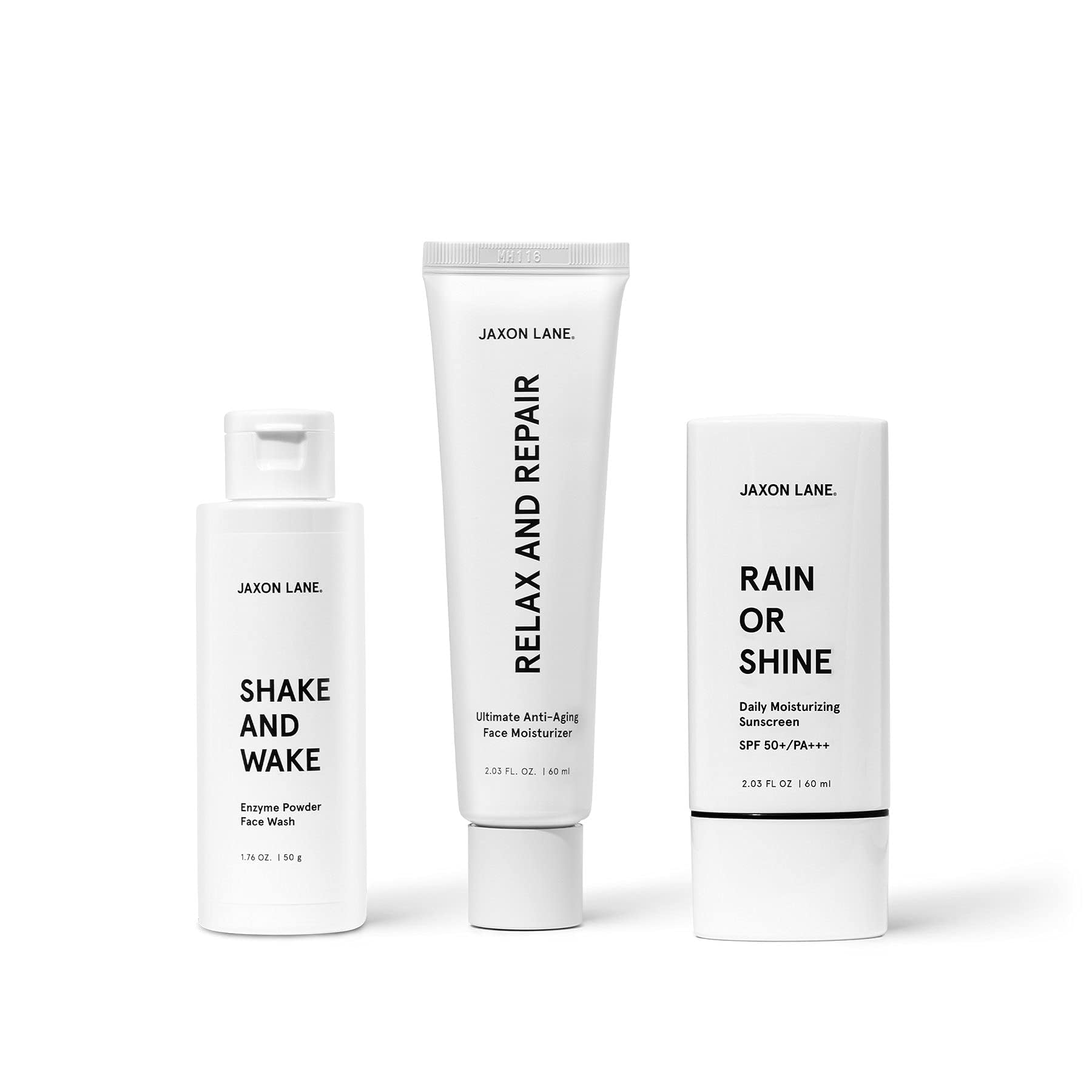 Your essential daily skincare routine. Cleanse, hydrate protect with our award-winning, dermatologist recommended skincare lineup. Rain Or Shine - Daily Moisturizing Sunscreen (60 ml) Relax And Repair - Ultimate Anti-Aging Moisturizer (60 ml) Shake And Wake - Enzyme Powder Face Wash (50 g). Some people may not know that we are exposed to UV rays even on cloudy days, which can age ski. But, many sunscreens are greasy or leave a white film. That's why we created a vitamin-packed, oil free, daily facial sunscreen SPF 50 that goes on smooth dries clear, so you can feel safe look great! Doing double duty as a Vitamin C moisturizer for face, it's enhanced with Vitamin E, Hyaluronic Acid, Green Tea, Licorice Root Ginseng extracts –Tons of antioxidants to prevent premature aging. Relax and Repair Turn back the clock and improve skin's tone texture with Relax and Repair –Harnessing the power of a face lotion for men, firming neck cream night cream for face all-in-one. It provides the skin-quenching moisture needed to help you regain a more youthful complexion –Because hydrated skin is healthier skin. Shake and Wake is Gentle enough to be used as a daily facial cleanser as natural face moisturizers Vitamin E Pure Aloe Vera gel make it an ideal face wash for men that won't strip facial oil as it cleans but nourishes deeply to reinforce skin's moisture barrier. Skin blemishes imperfections are slowly buffed away revealing smooth, soft glowing skin. Check out the complete line of Bro inspired face products from Jaxon Lane. Great gifts for men who have everything!? POWDER FACIAL CLEANSER: Our Shake and Wake Pineapple Papaya Enzyme Cleanser (50 g) transforms into creamy, face cleansing foam for polished skin with a healthy glow. Without water, active ingredients remain potent so they last longer. And, this granular foaming face cleanser can be customized to your skin –The amount of water added affects exfoliating scrub intensity. You'll be thrilled as powerful Alpha Hydroxy Citric Acid clears away dead skin cells accelerates cellular renewal. ?SKIN QUENCHING MOISTURE: Relax and Repair face lotion moisturizer for face (60 ml) is a non-greasy moisturizer for all skin types that can be used morning night. Not water based, we use Centella Asiatica leaf water –a medicinal plant Korean Beauty superstar ideal in face care. Rich in antioxidants with clinically proven regenerative properties, it yields intense hydration, soothes skin boosts collagen production. ? BROAD SPECTRUM FACE SUNSCREEN: UV exposure is the 1 cause of premature aging. Luckily, Rain or Shine sunscreen lotion 50 SPF (60 ml) blocks 98 of UV rays as opposed to SPF 15 which block only 93 . Protecting against both UVA UVB Light, our travel size sunscreen is the best in skin care for men with ginseng root, a strong antioxidant known to prevent aging maintain skin's elasticity, it won't leave a white chalky residue has no chemical odor. ? SAFE FOR SENSITIVE SKIN: Gentle non-irritating our facial skin care products are designed for all skin types, non-comedogenic and won't clog pores. Hypoallergenic formulas include Vitamin C for Face, Niacinamide, Ceramides to reinforce skins moisture barrier, Hyaluronic Acid to deeply hydrate, Green Tea Extract –A powerful agent for unclogging pores, ideal for acne prone skin, and Licorice Root powder to reduce hyperpigmentation and even skin tone. ?ADVANCED ANTI AGING TECHNOLOGY: Using the best of Korean skin care, Jaxon Lane brings you clean, anti-aging products for men that prevent correct signs of aging, while providing all day hydration sun protection. Our mens grooming products have high concentrations of active ingredients that aren't overly harsh on skin –No Artificial Fragrances, Color, Parabens or Phthalates and they're Cruelty Free. Everything you want in a natural skin care routine, nothing you don't!.