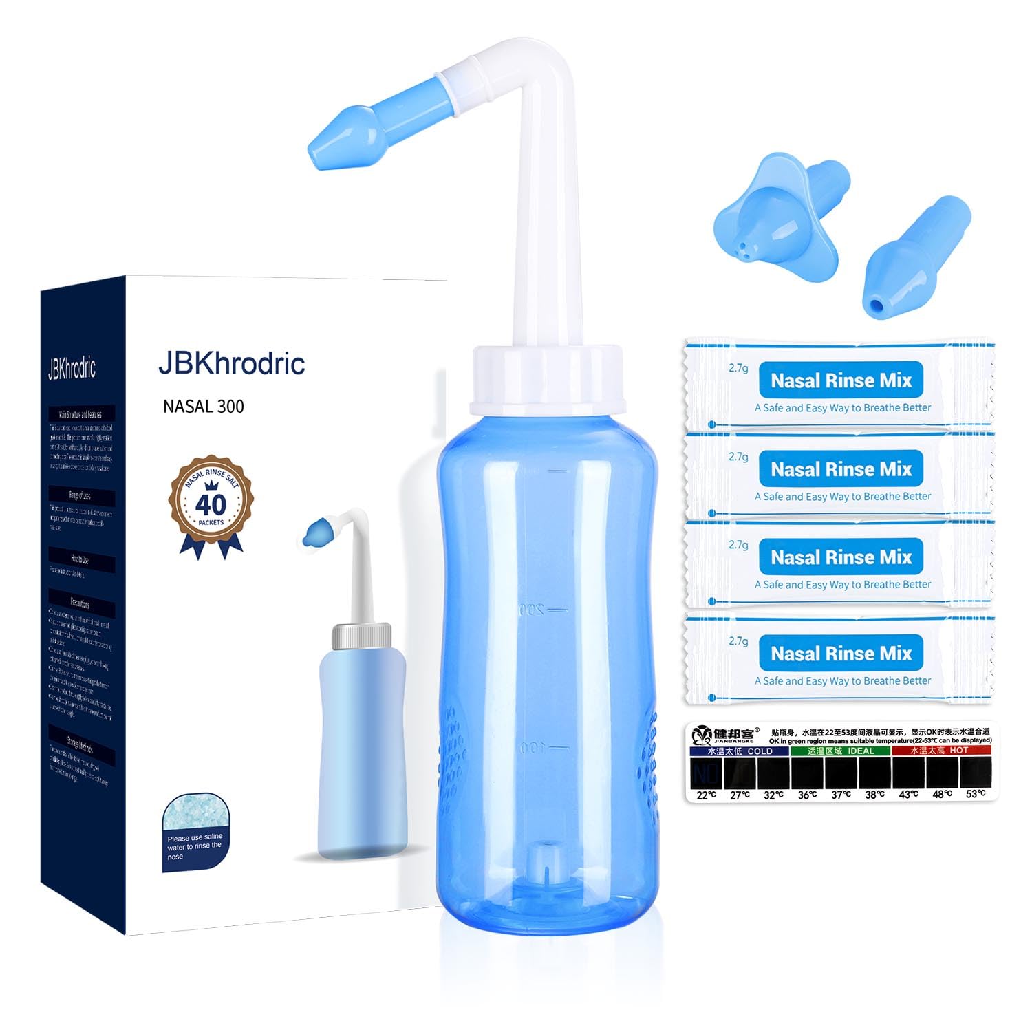 JBKhrodric Neti Pot Sinus Rinse Bottle Nasal Wash Bottle Sinus Rinsing Cleaner Pressure Rinse Nasal Irrigation with Sticker Thermometer for Adult & Kid (300ml with 40 Nasal Wash Salt Packets)