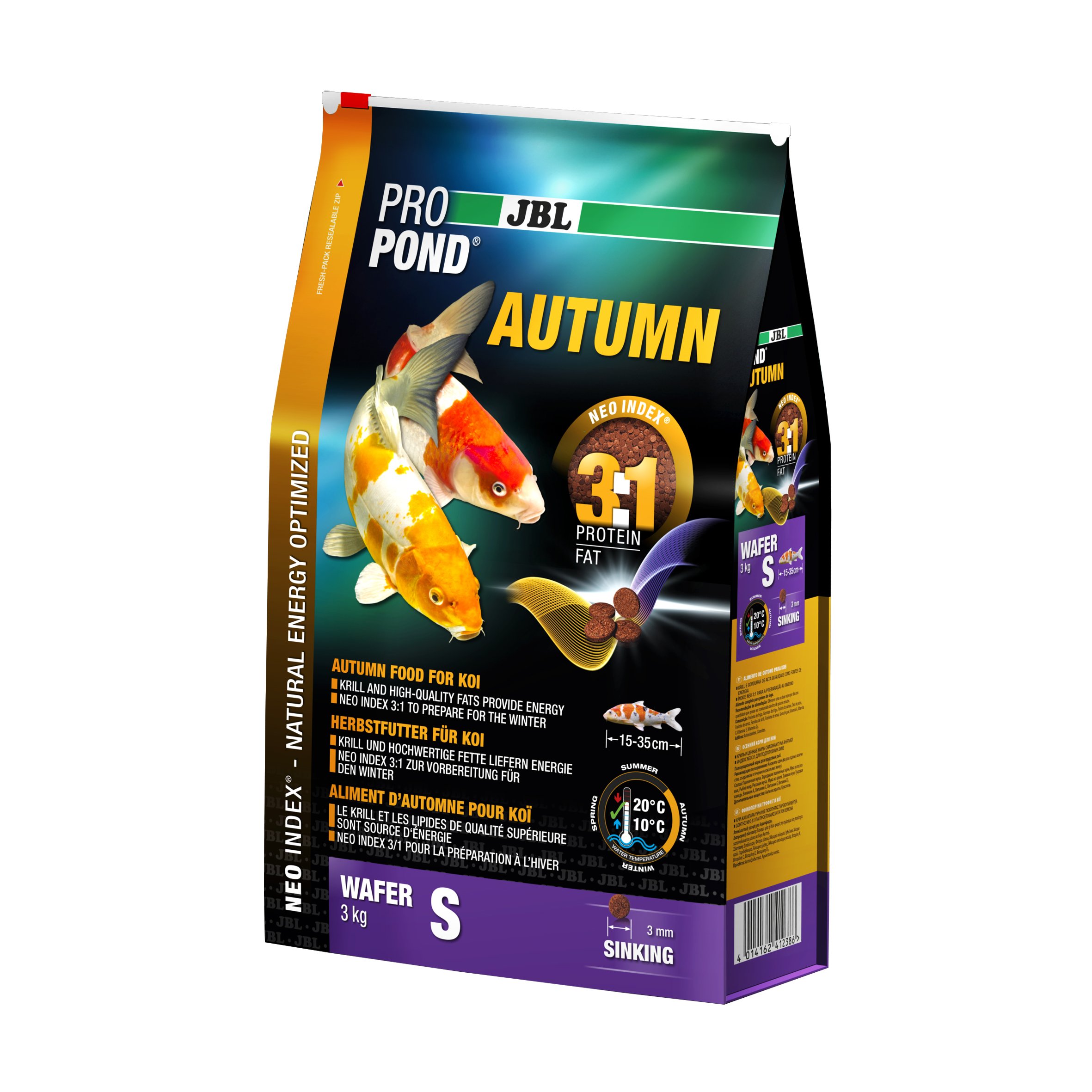 Autumn food for Koi of 15-35 cm, For water temperatures of 5 to 15 C of 10-25 C, Submersible Food Flakes - Adapted to special needs in autumn: Protein lipid ratio 3:1 according to the NEO index (Take into account water temperature, function, size and age), Preparation for winter - Healthy growth thanks to high-quality proteins high quality, High energy storage by omega 3 and 6 fatty acids, Color maintenance by carotenes, Optimal digestion and absorption of minerals and trace elements by raw ash content - Feeding advice: 1 to 2 times per day, In quantity consumable in a few minutes - Contents: 1 x JBL 3.0 kg, ProPond Autumn, Autumn food for Koi, Submersible Food Flakes, 4123800, Size: S, Resealable, Water and air resistant container INGREDIENTS Vitamins and similar (per 1000 g) - Vitamin C (stabil): 200 mg Vitamins and similar (per 1000 g) - Vitamin E: 300 mg Vitamins and similar(on 1000 g) - Vitamin D3: 2000 I. E. Vitamins and similar (on 1000 g) - Vitamin A: 25000 I. E. Wheat flour: 38.00 Wheat germs: 20.00 Salmon meal: 16.00 Fish oil: 10.00 Rice flour: 8.00 Krill meal: 4.00 Herb flour: 3.00 Guar gum: 1.00 Moisture: 8.00 Raw ash: 6.00 Crude fiber: 2.00 Crude fats: 10.00 Protein: 28.00 DIRECTIONS FOR USE Feeding advice: 1 to 2 times a day, In quantities that can be consumed in a few minutes BOX CONTENTS Food pellets in resealable bags airtight to water and light to maintain their quality. Contents: 1 x JBL 3.0 kg, ProPond Autumn, Autumn Koi Food, Submersible Food Flakes, 4123800, Size: S, Resealable, Water and airtight container. Feeding instructions: 1-2 times daily, In a quantity that can be consumed within minutes. Healthy growth thanks to high-quality protein, High energy storage thanks to omega 3 and 6 fatty acids, Color retention thanks to carotenes, Optimal digestion and absorption of minerals and trace elements thanks to crude ash content. Tailored to the special needs in autumn: Protein fat ratio 3:1 according to the NEO index (Consider water temperature, Function, Size and age), Preparation for winter. Autumn food for Koi 15-35 cm, For a water temperature of 5-15 C and 10-25 C, Submersible Food Flakes. Nourriture Automne pour Koïs de 15-35 cm, Pour une température de l'eau de 5 à 15 C de 10-25 C, Flocons Alimentaires Submersibles - Adapté aux besoins particuliers en automne: Rapport protéines lipides 3:1 selon l'indice NEO (Tenir compte de la température de l'eau, Fonction, Taille et âge), Préparation pour l'hiver - Croissance saine grâce à des protéines de haute qualité, Stockage énergétique élevé par acides gras oméga 3 et 6, Maintien de la couleur par carotènes, Digestion et absorption optimale des minéraux et oligo-éléments par teneur en cendres brutes - Conseils d'alimentation : 1 à 2 fois par jour, En quantité consommable en quelques minutes - Contenu: 1 x JBL 3,0 kg, ProPond Autumn, Nourriture Automne pour Koïs, Flocons Alimentaires Submersibles, 4123800, Taille: S, Refermable, Contenant résistant à l'eau et à l'air INGRÉDIENTS Vitamines et similaires(sur 1000 g) - Vitamin C(stabil): 200 mg Vitamines et similaires(sur 1000 g) - Vitamine E: 300 mg Vitamines et similaires(sur 1000 g) - Vitamine D3: 2000 I. E. Vitamines et similaires(sur 1000 g) - Vitamine A: 25000 I. E. Farine de blé: 38.00 Germes de blé: 20.00 Farine de saumon: 16.00 Huile de poisson: 10.00 Farine de riz: 8.00 Farine de krill: 4.00 Farine d'herbes: 3.00 Gomme de guar: 1.00 Humidité: 8.00 Cendres brutes: 6.00 Fibres brutes: 2.00 Graisses brutes: 10.00 Protéines: 28.00 MODE D'EMPLOI Conseils d'alimentation : 1 à 2 fois par jour, En quantité consommable en quelques minutes CONTENU DU COFFRET Pastilles alimentaires en sachet refermable étanche à l'air à l'eau et à la lumière pour conserver leur qualité. Contenu: 1 x JBL 3,0 kg, ProPond Autumn, Nourriture Automne pour Koïs, Flocons Alimentaires Submersibles, 4123800, Taille: S, Refermable, Contenant résistant à l'eau et à l'air. Conseils d'alimentation : 1 à 2 fois par jour, En quantité consommable en quelques minutes. Croissance saine grâce à des protéines de haute qualité, Stockage énergétique élevé par acides gras oméga 3 et 6, Maintien de la couleur par carotènes, Digestion et absorption optimale des minéraux et oligo-éléments par teneur en cendres brutes. Adapté aux besoins particuliers en automne: Rapport protéines lipides 3:1 selon l'indice NEO (Tenir compte de la température de l'eau, Fonction, Taille et âge), Préparation pour l'hiver. Nourriture Automne pour Koïs de 15-35 cm, Pour une température de l'eau de 5 à 15 C de 10-25 C, Flocons Alimentaires Submersibles.