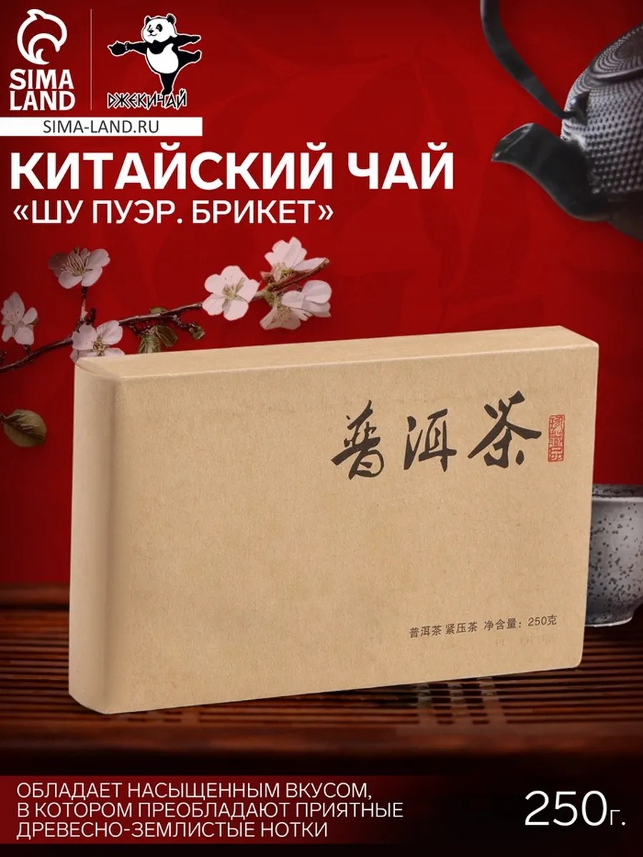 Chinese tea "Shu Pu'er Brick," produced in Menghai County (Yunnan Province, China), is a 250g brick of large-leaf black tea. This unique tea is made from young leaves with buds and undergoes a complex process, including withering, fermentation, drying, pressing, and ripening. Shu Pu'er impresses with a deep, rich flavor with woody-earthy notes and a multifaceted aroma, in which you can detect hints of prune, strawberry, and floral notes. The tea has a powerful tonic effect, helps improve performance, attention, and memory, and also activates metabolism and helps break down fat. For brewing, we recommend using a gaiwan or clay teapot. The product is packaged in a cardboard box and is well suited for a universal holiday.