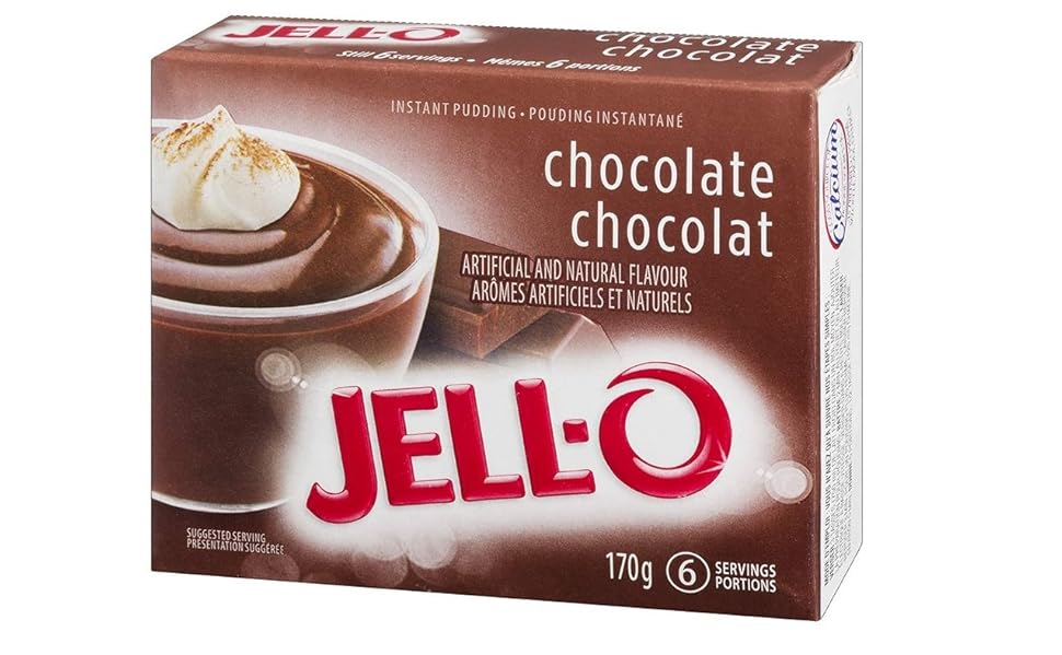 Jell-O Chocolate Instant Pudding Mix offers a delicious flavor, whether you eat it as a treat or use it as an ingredient in your favorite dessert recipes. The delicious chocolate flavor tastes great as a pie filling or as an ingredient in chocolate cake. The quick dessert is easy to make in just five minutes simply stir milk into the pudding powder and allow to set. You will quickly have a delicious pudding that the entire family will enjoy. The 170g box of Jell-O chocolate pudding mix comes individually packaged in a sealed pouch for freshness.Simply mix with milk and allow to set for 5 minutes. You will quickly have a delicious pudding that the entire family will enjoy. Individually packaged in a sealed pouch for freshness. Jell-O Chocolate Instant Pudding Mix tastes great alone or in desserts. One 170 g. box of Jell-O Chocolate Instant Pudding Mix.