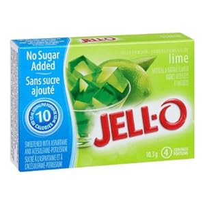 Jell-O Lime Jelly Powder Light is an easy to make lime flavored dessert. Perfect for cooling off on a hot day, this mouthwatering treat delivers the classic refreshing lime taste you know and love. With only 10 calories per serving, this dessert is one you can feel good about sharing with your family. This 10.3g package makes four servings so you can prepare enough for the whole family. It's easy to make a tasty dessert for kids or adults. Simply mix the gelatin with boiling water, stir in cold water, and refrigerate until set.Only 10 calories per serving. Package makes four 1 2-cup servings. Jell-O Lime Jelly Powder Light is an easy to make lime flavored dessert - just stir the mix with boiling and cold water and refrigerate. One 10.3g box of Jell-O Lime Jelly Powder Light.