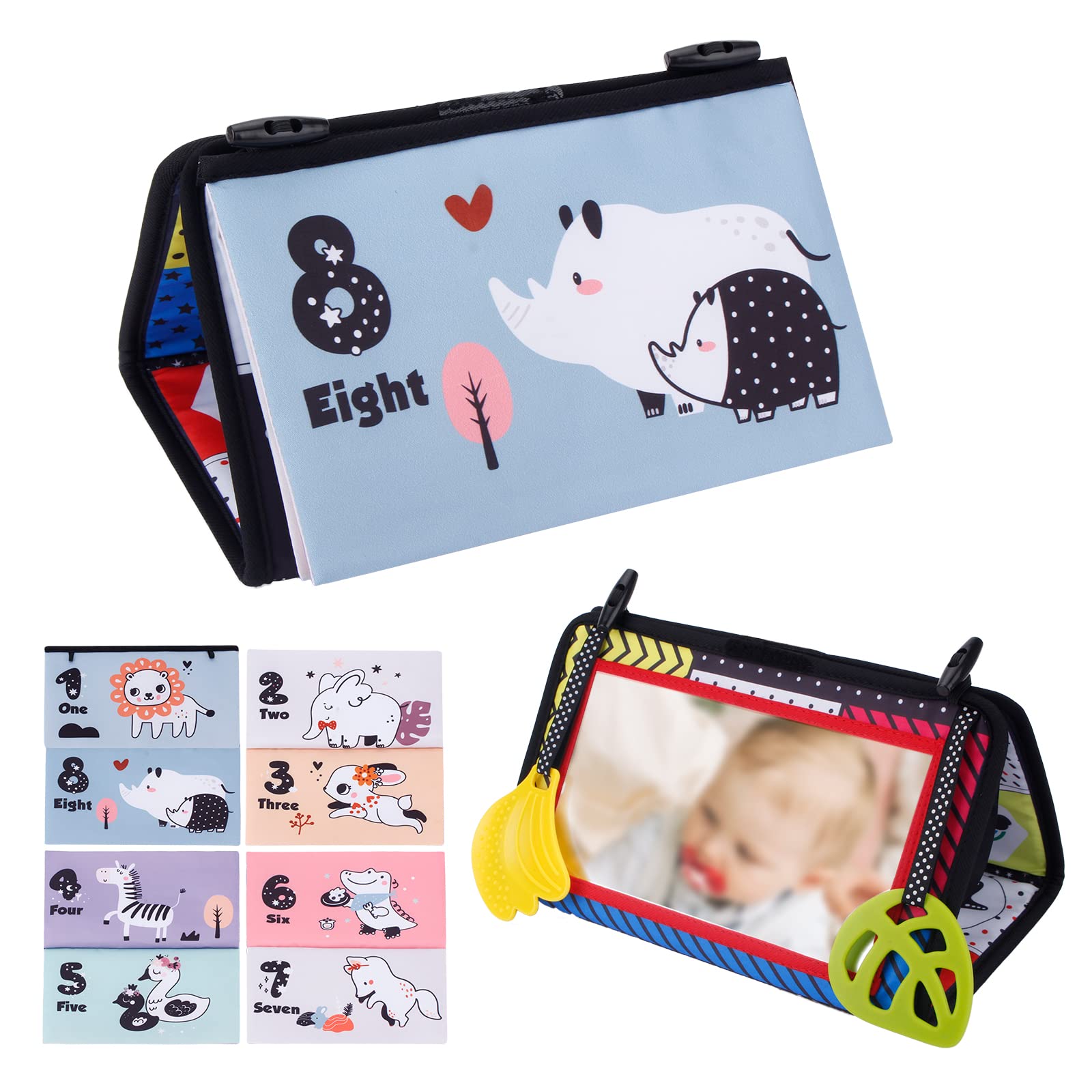 [Multi-Scene] It is foldable, small size and easy to carry on. Can be used at home, car seat, etc., anytime, anywhere so that the baby can still play in busy, is an excellent early education toys and gifts. [Baby's Cognition] Crinkle cloth book Use the buckle to fix the colorful cloth book. 4 pages cloth book to enhance "sasa" will be issued when baby grasped by hand, it is to promote baby's auditory development. [Soft Fabric] baby books made of tear-resistant fabrics which is durable and washable. No need to worry about dangerous parts. Washing to keep book clean. [Safe & Soft Teether] Baby mirror with two reversible teether, food-grade silicone material, non-toxic. [Baby Cloth Book] Newborn babies have blurred vision, high contrast patterns can attract baby's eyes, good for infant visual development.