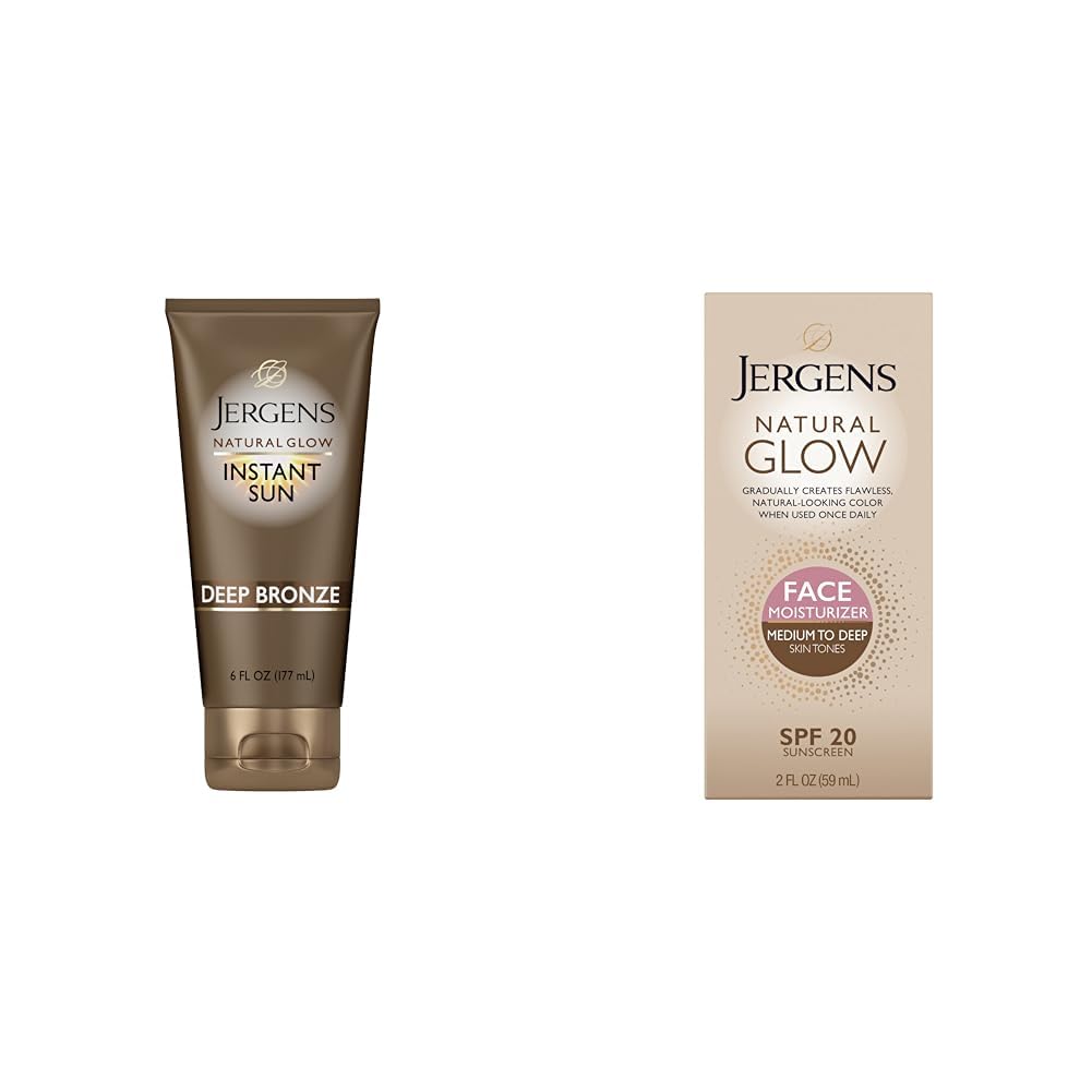 Jergens Natural Glow Instant Sun Sunless Tanning Moisturizer Bronzer, Self Tanner, Deep Bronze, for Natural-Looking Tan, 6 Ounce Now here's a sunless tanning lotion that understands spontaneity. Meet Jergens Natural Glow Instant Sun Sunless Tanning Moisturizer Bronzer. This beach party in a bottle brings on bronzy natural-looking color instantly while developing into a deeper, flawless tan within hours. Infused with coconut oil, vitamin E and tinted bronzers, this self tanner smooths dry skin while working with your unique skin tone to spread sun-kissed color evenly and last for days. Satisfaction Guaranteed. Limitations may apply. Jergens Natural Glow Self Tanner Face Moisturizer, SPF 20 Facial Sunscreen, Medium to Deep Skin Tone, Sunless Tanning, Oil Free, Broad Spectrum Protection UVA and UVB, 2 oz (Packaging May Vary) A safe, natural-looking glow without the sun is possible with Jergens Natural Glow Oil-Free Daily Moisturizer for Face with Broad Spectrum SPF 20. This lightweight, oil-free moisturizer that is specially formulated for the face is infused with color-enhancing ingredients, nourishing emollients, and broad spectrum sunscreen. It delivers flawless, natural-looking color to the skin while keeping it hydrated and helping to protect against exposure to the sun. Applying at least once per day will enhance your natural skin tone within several days, and you'll have a beautiful, natural-looking glow in about one week. Use it in the morning under makeup, or at night before going to bed. Recommended by the Skin Cancer Foundation, Kao USA Jergens Natural Oil-Free Daily Moisturizer for Face with Broad Spectrum SPF 20 protects against both UVA and UVB rays. Satisfaction Guaranteed. Limitations may apply.Product 2: PROTECTION FROM THE SUN - Our lightweight Natural Glow face moisturizer keeps your skin hydrated and includes broad-spectrum UVA and UVB protection. Product 2: FLAWLESS SELF TANNER - Create a flawless tan for gradual, natural-looking color before, or after, the beach. Product 1: FRESH SCENTED SUNLESS TANNING - Jergens Natural Glow Instant Sun Sunless Tanning Moisturizer Bronzer will keep you feeling fresh with a light, coconut scent. Product 1: ENHANCE YOUR SKIN TONE - Formulated with a blend of coconut oil, vitamin E and tinted bronzers, our bronzing tanning lotion moisturizes the skin and helps provides streak-free color. Product 1: FLAWLESS SELF TANNER - Create a flawless tan for gradual, natural-looking color before, or after, the beach. Product 1: STREAK-FREE, STICKY-FREE, DRAMA-FREE - This bronzing tanning lotion gives you a natural-looking tan without the stress and mess.
