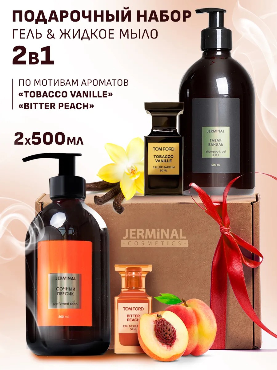 Изысканный подарочный набор парфюмированных средств гель для душа 2в1 и жидкое мыло для рук от JERMiNAL-COSMETICS включает в себя два флакона объемом по 500 мл каждый, предлагая эксклюзивные ароматы Tobacco&Vanille и Bitter&Peach. Благодаря своей универсальности, мыло подходит как для взрослых, так и для детей, обеспечивая мягкий уход за кожей рук и тела.