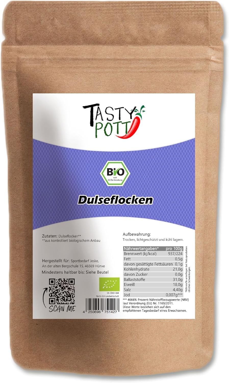 Red algae flakes from the Atlantic Ocean. INGREDIENTS Dulsflakes from organic cultivationWorth knowing: the diuls flakes are algae flakes from a red algae, also called bacon algae, which occurs in the Atlantic Ocean. Ingredients: very high fiber content, lots of natural iodine, vitamin B12 and vegetable proteins make the duls flakes a real superfood. Quality - From qualified, biologically controlled wild collection in the Atlantic Ocean. Carefully harvested, processed and packaged. Use: use the flakes as a soup insert, on salads or in stews. It even makes sense to incorporate them into vegetable smoothies. Contents: You will receive high-quality organic duls flakes from the Atlantic Ocean, filled in a resealable bag.Biologische dulsvlokken, diulsealgen, algen, diulsvlokken, groentesmoothie, voor soepen en salades, natuurproduct, algen, in zak, 100 g (2 x 100 g) Rode algenvlokken uit de Atlantische Oceaan. INGREDIËNTEN Dulsvlokken uit biologische teeltWetenswaardigheid: bij de diulsvlokken gaat het om algenvlokken van een rode alg, ook wel spekalgen genoemd, die in de Atlantische Oceaan voorkomt. Ingrediënten: zeer hoog vezelgehalte, daarbij veel natuurlijk jodium, vitamine B12 en plantaardige eiwitten maken de dulsvlokken tot een echt superfood. Kwaliteit - Uit gekwalificeerde, biologisch gecontroleerde wilde collectie in de Atlantische Oceaan. Voorzichtig geoogst, verwerkt en verpakt. Gebruik: gebruik de vlokken als soepinzetstuk, over salades of in stoofschotels. Zelfs in groentesmoothies is het zinvol om ze mee in te werken. Inhoud: je ontvangt hoogwaardige biologische dulsvlokken uit de Atlantische Oceaan, in hersluitbare zak gevuld.