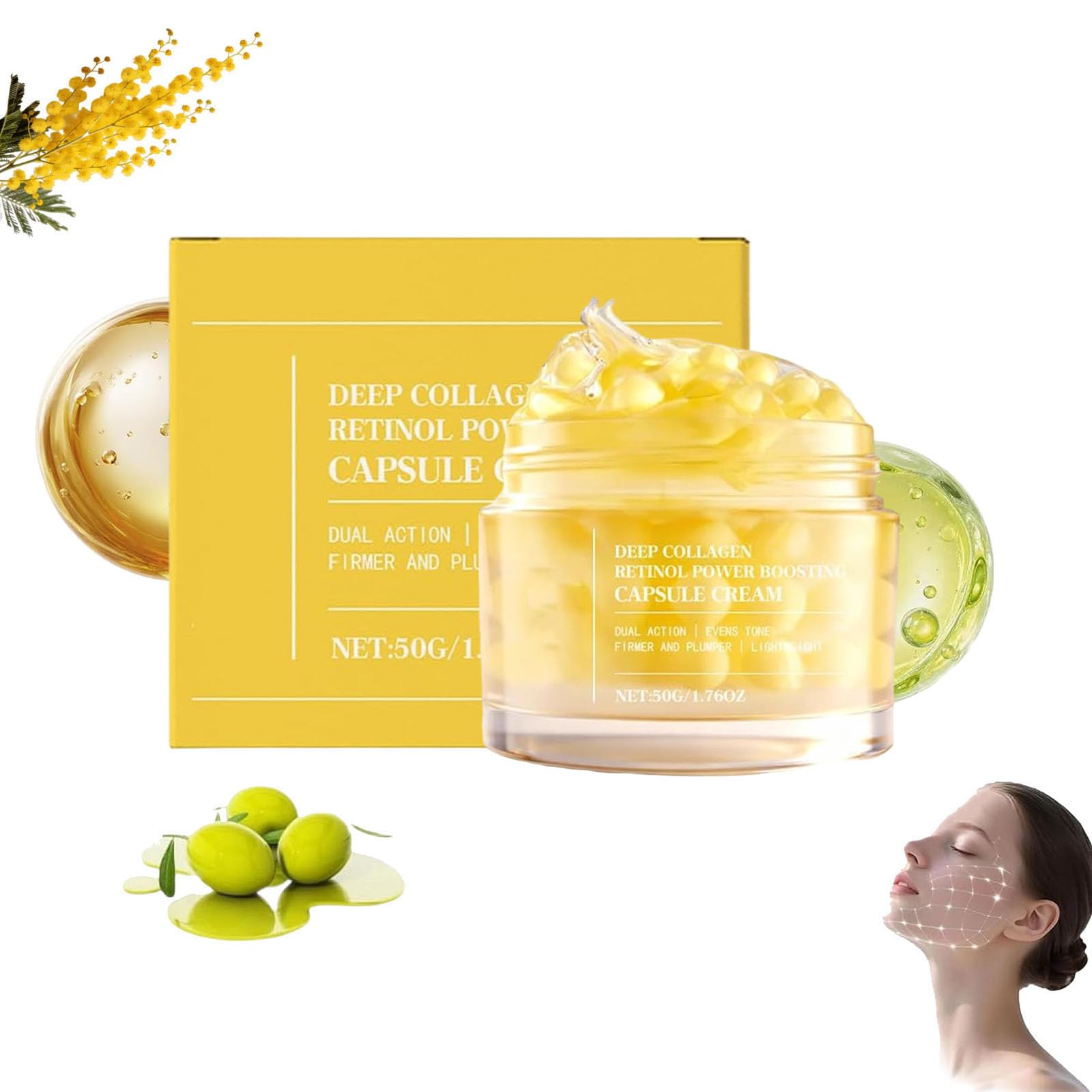 Specifications: Product Name: Collagen Retinol Cream Capsules Net Contents: 50g Shelf Life: 3 years Package Contents: 1 2 Collagen Retinol Cream Capsules Note: 1. Please allow 1-2 cm error due to manual measurement. 2. The actual color of the item may vary slightly from the image due to differences in monitor settings and lighting. Thank you for your understanding. SAFETY WARNING Store in a cool, dry place away from direct sunlight. Keep out of reach of children.Application: This is a versatile day and night cream for men and women, suitable for all skin types. Intensive Care: This cream, with its transparent gel-like texture, intensely hydrates and locks in moisture, making it ideal for dry or stressed skin and helping you achieve a softer, brighter complexion. Brightening and Soothing Effect: This face cream brightens the complexion, smooths the skin, and improves its appearance without feeling heavy. It gives the skin a healthy glow and is suitable for daily use. Intense Moisturizing Care: This retinol face serum provides long-lasting hydration, softens and smooths the skin, and improves dryness. Moisturizing and Hydrating: This retinol collagen cream combines creamy textures with a lightweight gel that intensely hydrates, locks in moisture, and leaves skin radiant.Deep Collagen Retinol Power Boosting Capsule Cream, Collagen Retinol Capsule Cream, Intensive Hydrating, Improve Firm Elasticity, Brightening Soring Skin, Convient à tous les types de peau (1 1 pièce.DESCRIPTION DU PRODUIT DESCRIPTION DU PRODUIT Spécifications: Nom du produit : crème capsule de collagène rétinol Contenu net : 50 g. Durée de vie : 3 ans. Contenu de l'emballage : 1 2 gélules de crème au collagène et au rétinol. Remarque : 1. Les mesures étant prises à la main, les tailles indiquées peuvent varier de 1 à 2 cm. 2. La couleur de l'article peut varier de celle de la photo, en fonction des paramètres d'affichage et de luminosité de votre ordinateur. Merci de votre compréhension. AVERTISSEMENT DE SÉCURITÉ Conserver dans un endroit frais et sec et à l'abri de la lumière du soleil. Tenir hors de portée des enfants.Application : il s'agit d'une crème polyvalente de jour et de nuit pour hommes et femmes, pour tous les types de peau. Soin intensif : cette crème gélule avec un gel transparent hydrate et retient intensément ce qui la rend adaptée aux peaux sèches ou stressées et vous aide à obtenir un teint plus doux et plus brillant. Effet éclaircissant et apaisant : cette crème pour le visage éclaircit le teint, lisse la peau et améliore son apparence sans se sentir lourde. Elle donne à la peau une brillance saine et convient à un usage quotidien. Soin hydratant intense - Ce sérum au rétinol pour le visage hydrate durablement, adoucit et adoucit la peau et améliore la sécheresse. Hydratant et hydratant : cette crème au collagène au rétinol combine des textures crémeuses avec un gel léger qui hydrate intensément la peau, l'emprisonne, l'hydrate et la rend éclatante.