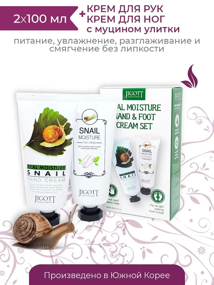 The Jigott Real Mousture Hand & Foot Cream Set effectively restores dry, dull, and aging skin. Key benefits include deep nourishment, hydration, and accelerated recovery of damaged areas. Immediately after application, skin becomes velvety, soft, and supple. The benefits also include the absence of a sticky layer or film. The active ingredients accelerate cell regeneration, prevent dry skin, and moisturize and nourish. The formula contains urea, which softens the keratinized layers of the epidermis and eliminates cracks and dryness. Using these products together will achieve maximum results. Directions for use: Apply the required amount to pre-cleansed, slightly damp skin and massage until completely absorbed. Use daily, as needed.