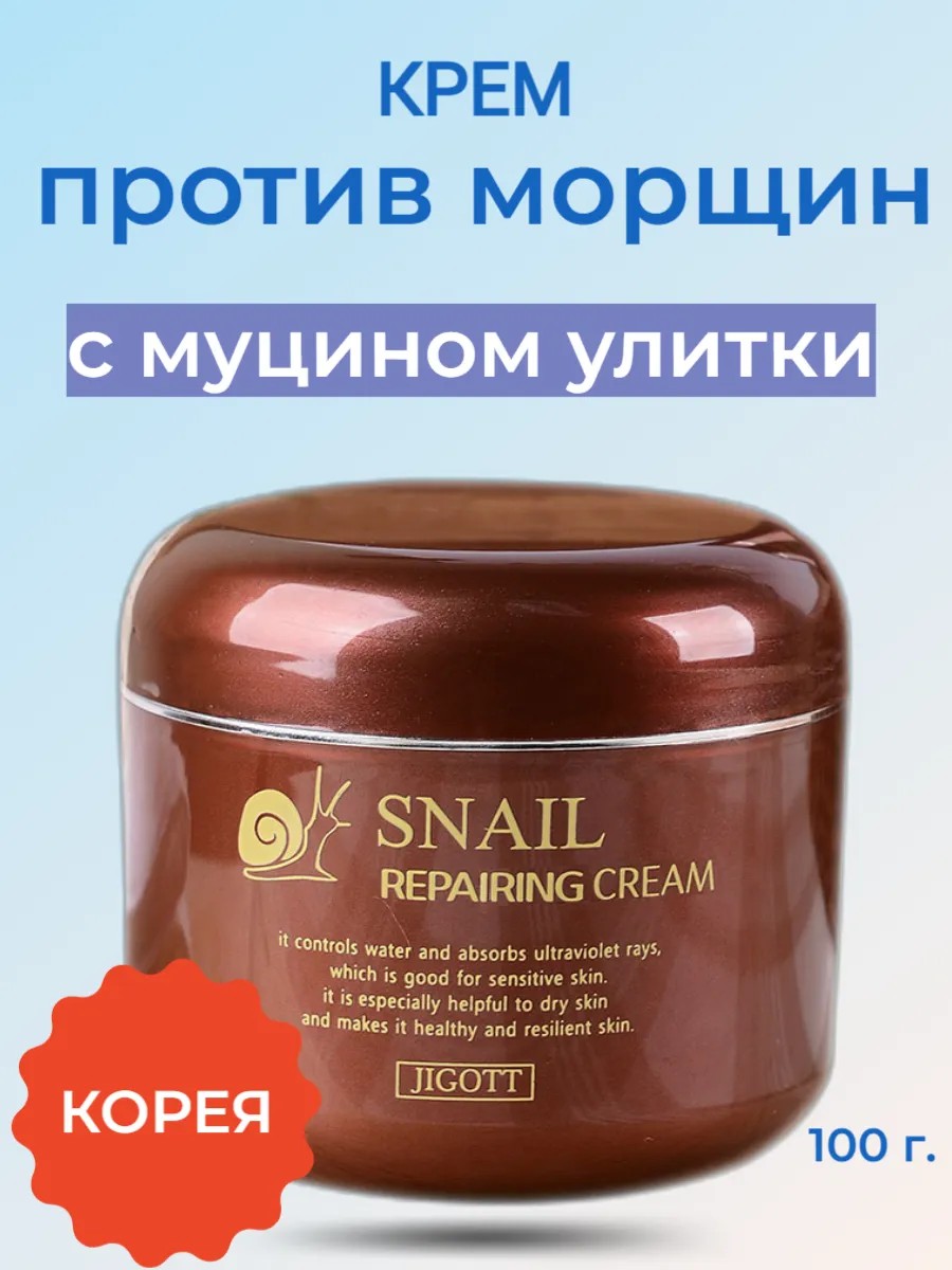 Jigott Snail Reparing Cream, a restorative anti-aging cream with Botox and snail mucin, effectively restores both dry, aging skin and teenage problem skin. Snail mucin filtrate has a comprehensive healing effect, promotes active regeneration, thereby reducing the depth and number of wrinkles, effectively brightens, eliminating pigmentation of various origins and traces of post-acne, stimulates the narrowing of pores and normalizes the functioning of the sebaceous glands, has an active anti-inflammatory effect, binding to bacteria on the skin's surface and preventing their proliferation. It also helps accelerate healing and the absorption of stagnant spots, scars, and marks. Directions: Use as the final step in skin care. Apply a small amount of cream to the face and neck, gently patting the cream into the skin.