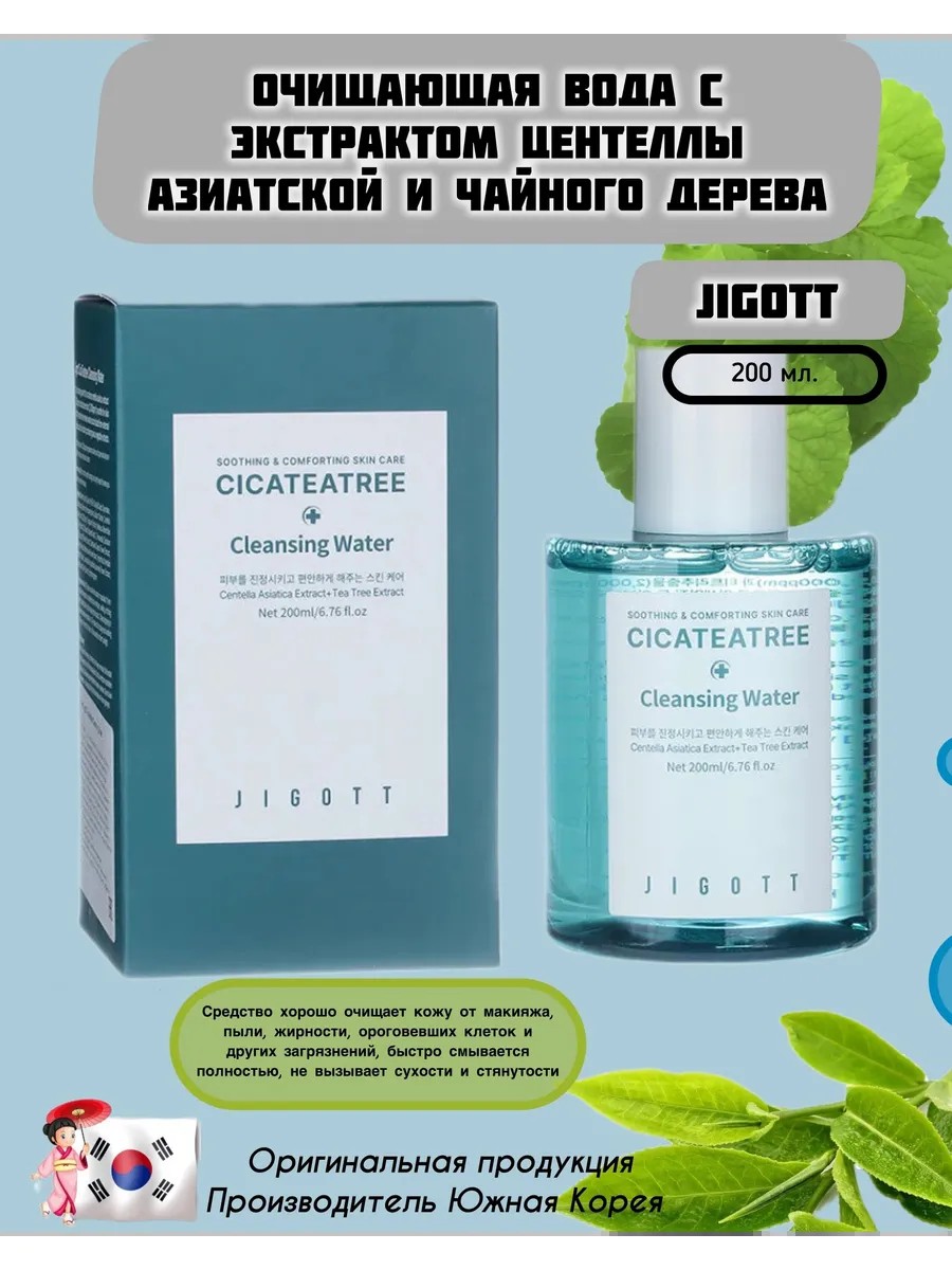 Очищающая вода с экстрактом центеллы азиатской и чайного дерева Cleansing Water южнокорейской марки Jigott предназначена для ухода за проблемной, сухой и чувствительной кожей, также подойдёт комбинированной, может использоваться для области вокруг глаз. Средство хорошо очищает кожу от макияжа, пыли, жирности, ороговевших клеток и других загрязнений, быстро смывается полностью, не вызывает сухости и стянутости.