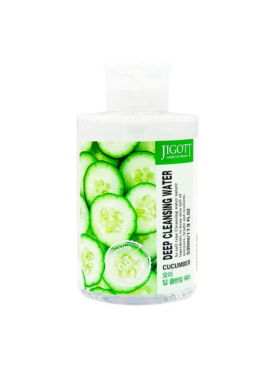 Очищающая вода для лица с экстрактом огурца Deep Cleansing Water Cucumber южнокорейской компании Jigott бережно и тщательно удаляет остатки косметических средств и ороговевших клеток, жирность, пыль и другие загрязнения с поверхности кожного покрова любого типа. Нежная консистенция продукта экономно расходуется, хорошо пенится, быстро впитывается, не создаёт ощущения липкой плёнки. Бутылочка оборудована профессиональным дозатором, что делает ее удобной в использовании.
