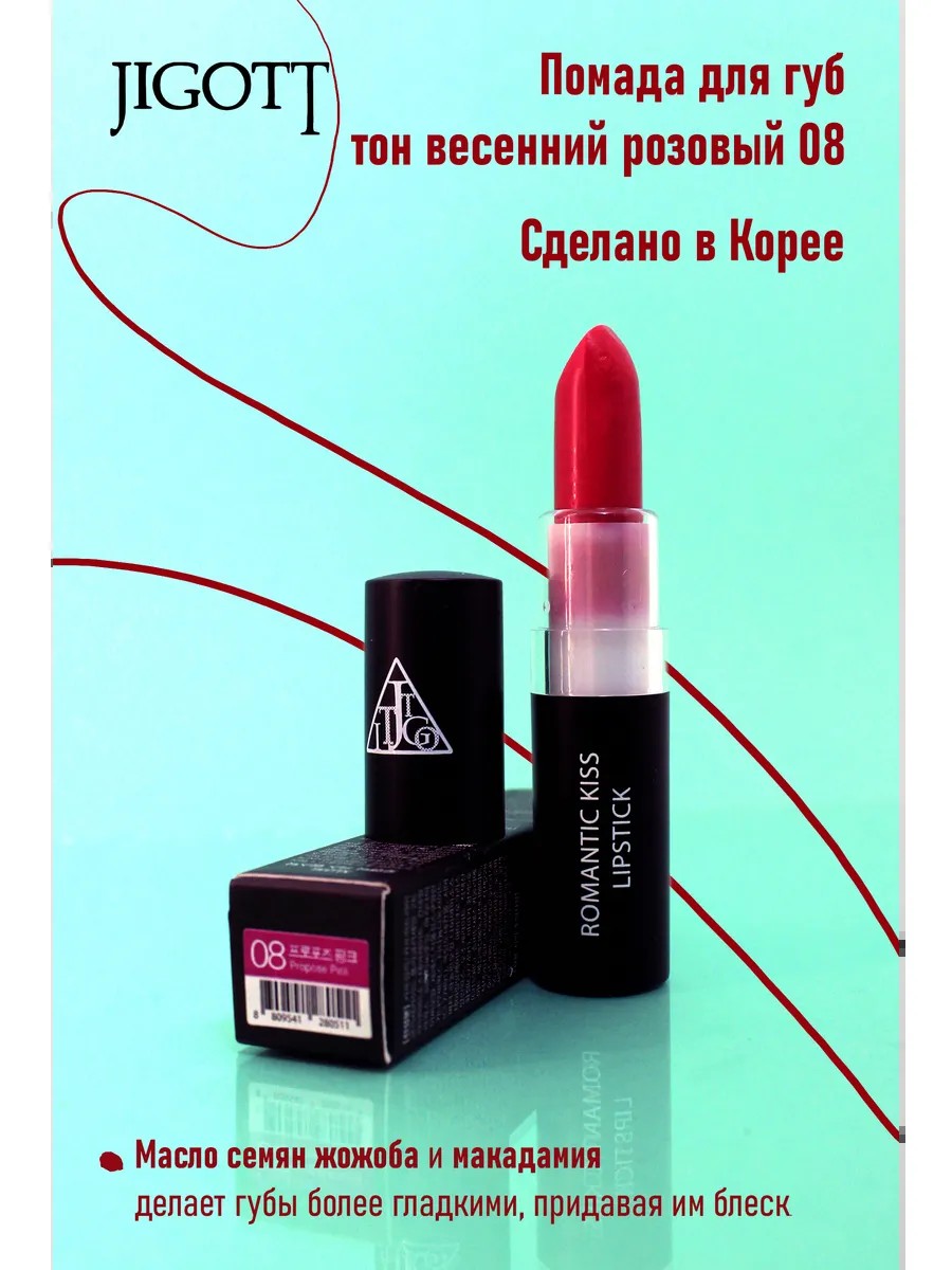 Помада для губ Jigott Romantic Kiss Lipstick придает губам блеск и головокружительный объем. Содержит растительный сквалан, масло семян конопли и масло ши для увлажнения и питания губ. Касторовое масло придает губам эластичность и отлично предотвращает сухость, создавая защитную пленку. Хорошо распределяется по губам, не оставляя пробелов; Удлительный увлажняющий эффект; яркие цвета; сверкающий блеск и головокружительный объем. Надежное окрашивание одним касанием! Нанесите достаточное количество продукта на предварительно очищенную кожу губ.