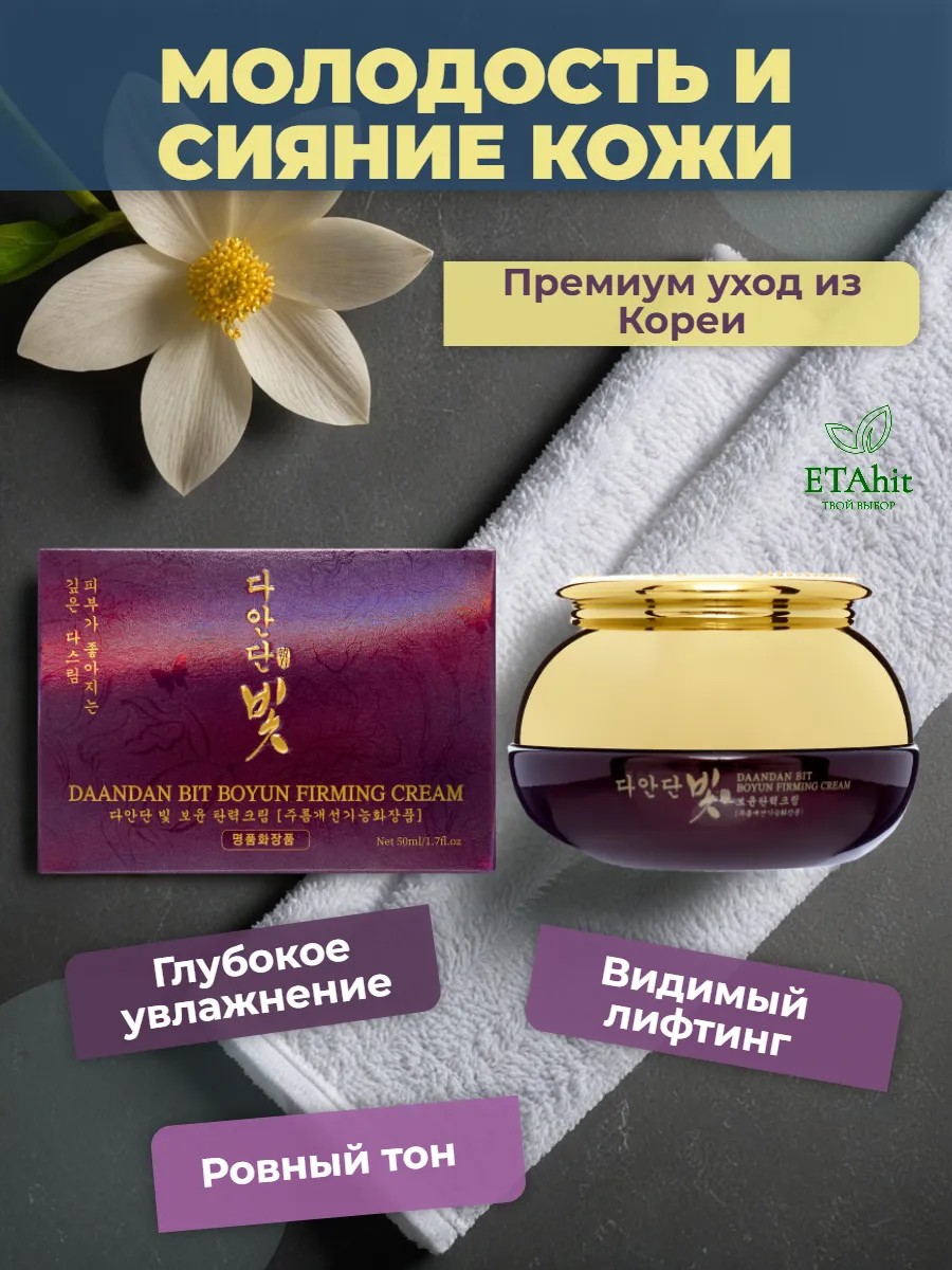 Насыщенный, питательный ночной крем DAANDANBIT BOYUN FIRMING CREAM идеально подходит для зрелой кожи лица. Формула основана на стволовых клетках, антиоксидантах. Также в составе есть укрепляющие и смягчающие вещества для борьбы с многочисленными признаками старения. В отличие от аналогов, DAANDANBIT BOYUN FIRMING CREAM не просто корректирует существующие недостатки, а стимулирует рост новых, здоровых клеток дермы. Основные функции косметического средства: укрепляет кожу, дарит лицу сияние, упругость и гладкость, стирает тонкие морщинки, смягчает грубые, обветренные или пересушенные солнцем участки. Инновационные компоненты помогают поддерживать нормальный внутриклеточный обмен веществ, уменьшают сеточку из морщин. При ежедневном использовании лицо преобразится.