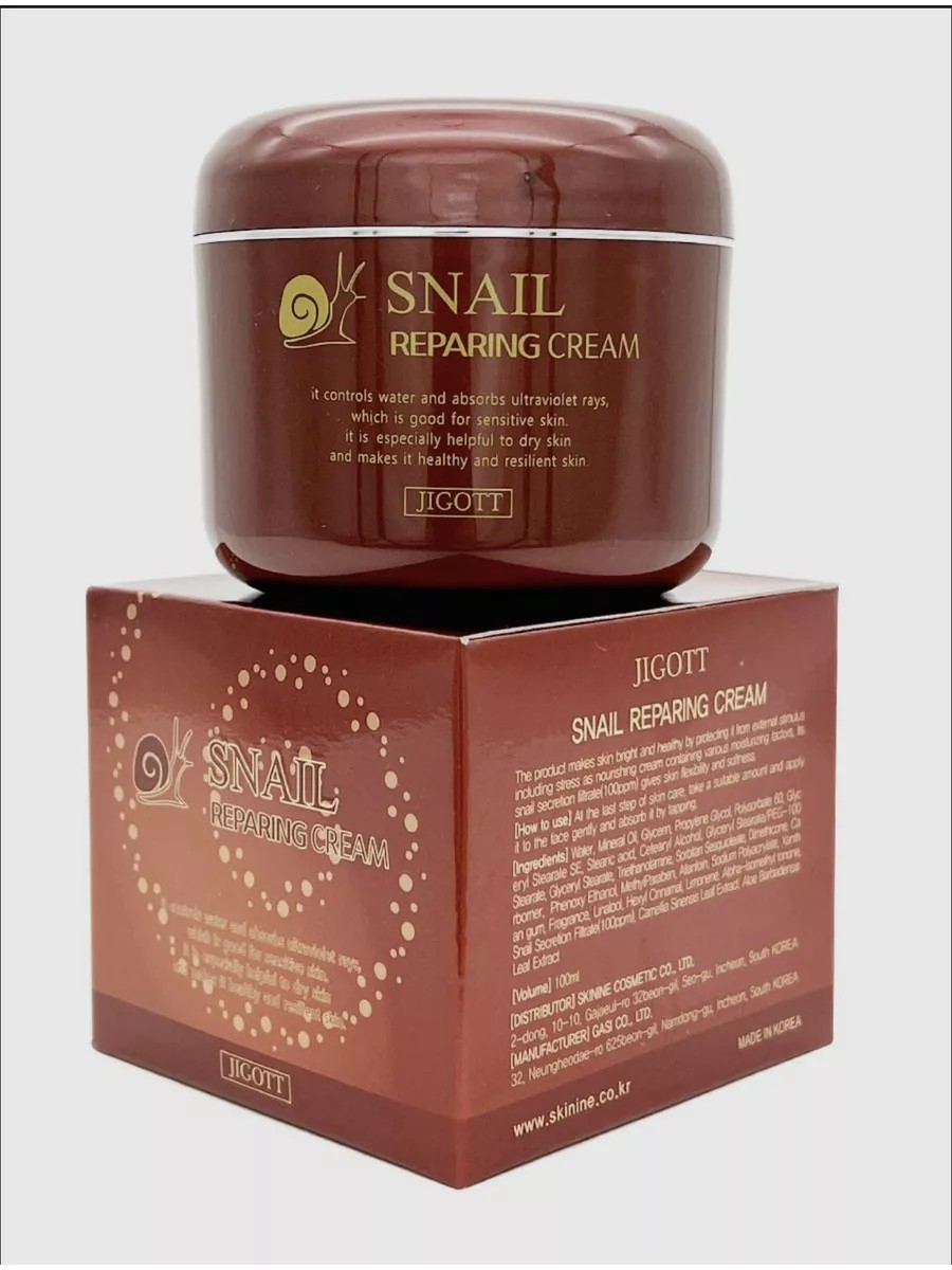 Jigott Snail Repairing Cream, a face cream with snail mucin, contains snail mucin, niacinamide, and aloe vera extract, promoting collagen synthesis and overall skin renewal three times more effectively.