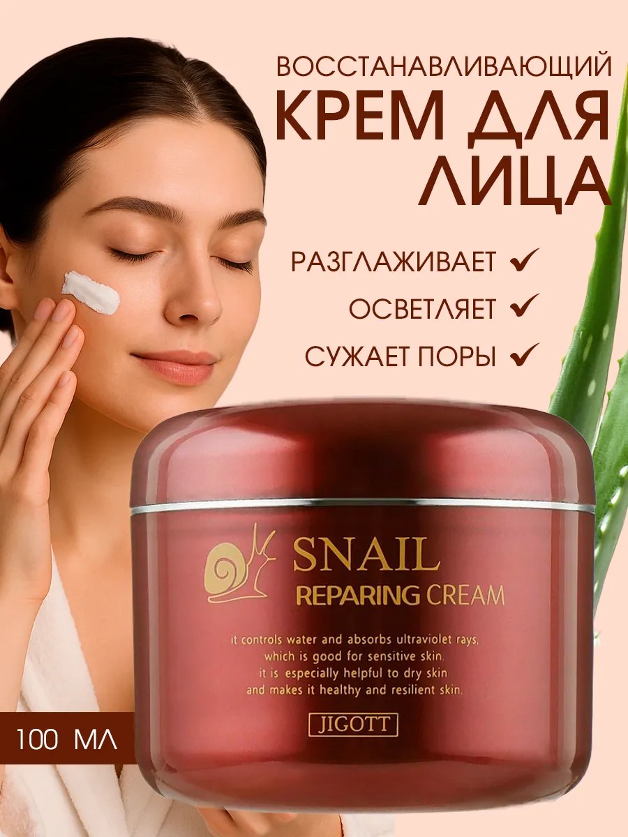 Корейский увлажняющий крем с муцином улитки Jigott Snail Reparing Cream интенсивно восстанавливает поврежденную, потерявшую тонус кожу лица. Разглаживает мимические морщинки и осветляет. При регулярном применении кожа становится гладкой, упругой и эластичной.