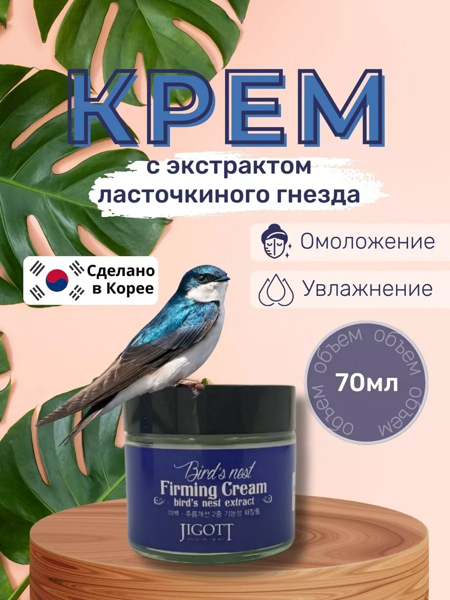 Крем для лица от морщин с экстрактом ласточкиных гнезд Jigott улучшает общее состояние кожи, разглаживает морщины и препятствует появлению новых, обеспечивает эффект лифтинга, освежает и смягчает кожу, глубоко увлажняет и питает, улучшает цвет лица, наделяя кожу внутренним сиянием, стимулирует процесс регенерации тканей, повышает упругость и эластичность кожи, моделирует овал лица. Экстракт ласточкиного гнезда - источник важных минералов, полисахаридов и антиоксидантов. В восточной медицине этот продукт признан лучшим косметическим средством с потрясающим омолаживающим эффектом.**Способ использования:**Небольшое количество крема нанести на чистую подготовленную кожу лица и шеи. Легко распределить по массажным линиям, остатки крема вбить похлопывающими движениями. Использовать 1-2 раза в день после тоника и сыворотки для лица.крем для лица ласточкино гнездо крем для лица корея крем для лица корейская косметика